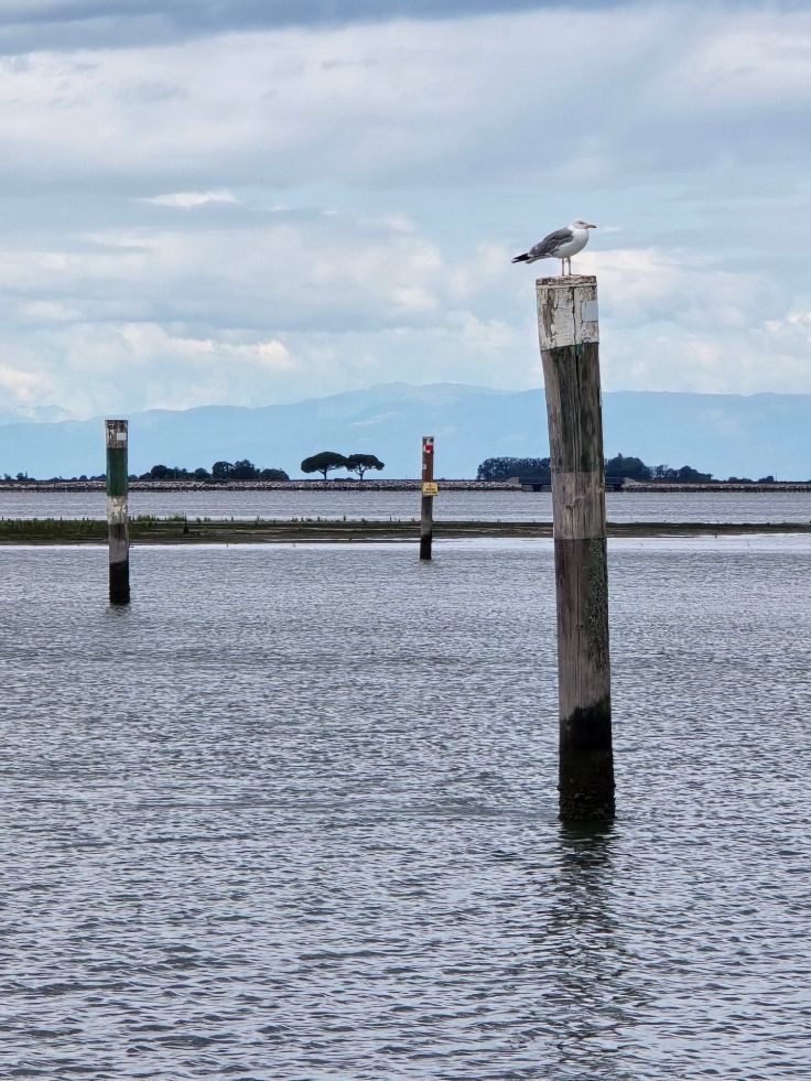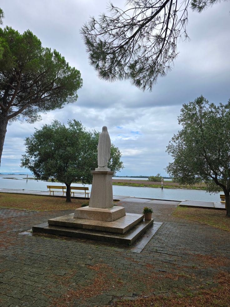 Die Fahrt führt zunächst entlang dem Kanal, später durch die Lagunenlandschaft, und dauert etwa 25 Minuten. Wir haben einen regnerischen Tag erwischt, dichte Wolken hängen über dem Inselchen und verleihen ihm etwas Mystisches. Das Schiff legt in einem kleinen Hafen an, überall sehen wir Schilder, die auf den Privatbesitz der Insel hinweisen und das Baden verbieten – es ist ein heiliger Ort. Wir laufen durch den frei zugänglichen Teil der Insel und freuen uns über die zahlreichen Bäume, die uns vor dem leichten Nieselregen schützen, an heißen Tagen werden die Pilger die Bäume als Schattenspender ebenso schätzen. Am Ort, wo heute die Wallfahrtskirche steht, soll im 6. Jahrhundert der Eremit Barbanus eine angespülte Marienstatue gefunden haben, seither steht hier ein Gotteshaus. Die heutige Kirche wurde im 18. Jahrhundert erbaut und Anfang des 20. Jahrhunderts erweitert und umgestaltet. Heute ist sie nicht nur das Ziel von Tagestouristen, die die Fahrt durch die Lagunenlandschaft und die Ruhe des Eilands genießen, sondern vor allem auch das Ziel von Pilgergruppen. Alle freuen sich gleichermaßen über das gute und günstige Restaurant „Al Pellegrino“ (Zum Pilger), auch ein kleiner Shop ist vorhanden. Ein netter Ausflug, gerade an einem leicht verregneten Tag!