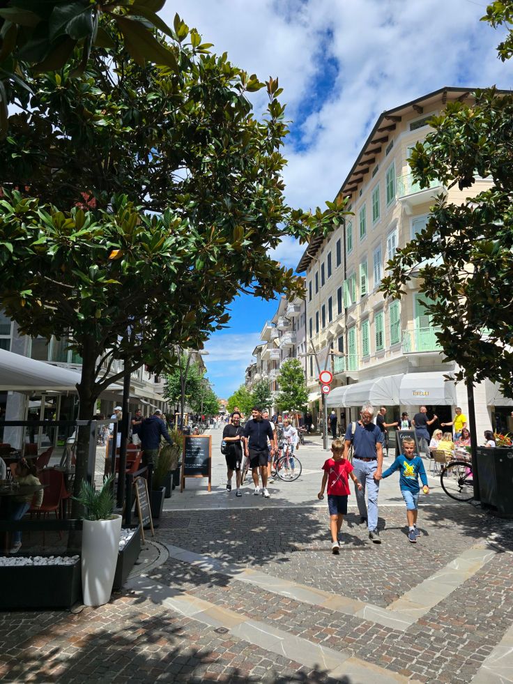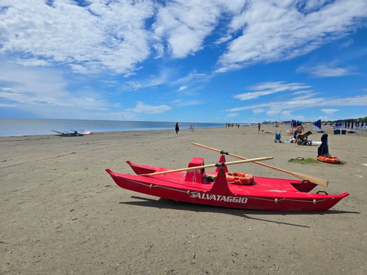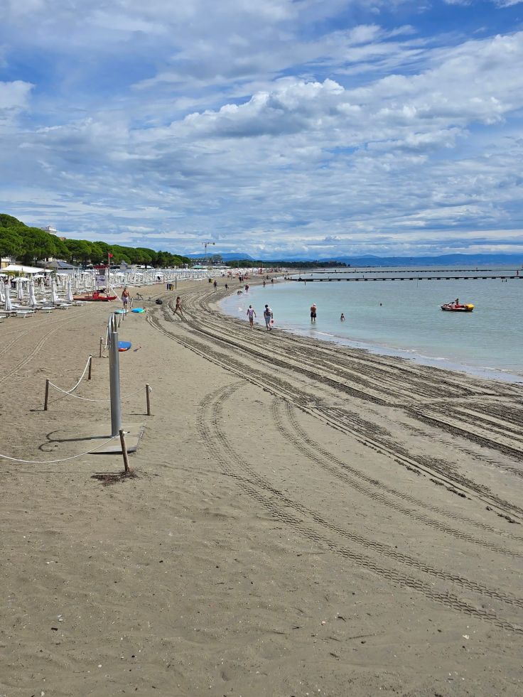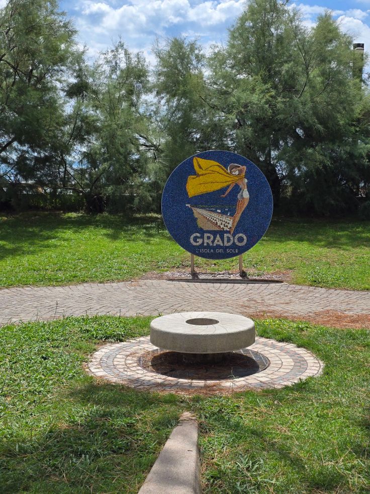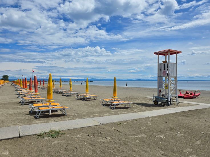 Vom alten Hafen (Porto Vecchio mit Fotorahmen Nummer 1) ausgehend kann Grado auch eine moderne Fußgängerzone auf der Viale Europa Unita vorweisen. Sie führt in den Giardini Palatucci nebst dekorativem Fotorahmen Nummer 2. Hier beginnt besagter östlich der Altstadt liegende Hauptstrand, Spiaggia Principale. Also wenn ich gegen eines „allergisch“ bin, dann gegen komplett eingezäunte Badestrände, die Eintritt auch für Spaziergänger verlangen. Es reicht ja schon, dass die Strandpächtermafia in Italien jedes Jahr ihre Preise erhöht. 100,- Euro pro Familie (zwei Schirme und vier Liegen) pro Tag sind italienweit laut einem aktuellen ZDF-Bericht keine Seltenheit. Am Hauptstrand von Grado wären wir 2025 zu viert 64,- Euro los, plus 16,- Euro Eintritt, hinzu käme noch die Parkgebühr, also tatsächlich knapp 100,- Euro. Und das jeden Tag! Besser als der Hauptstrand gefällt uns da schon der weitläufigere Strand von Grado Pineta noch weiter östlich. Hier kosten Sonnenschirm und Liegen zwar annähernd das gleiche, aber es ist auch genug Platz da, sein eigenes Handtuch auszubreiten. Wundert sich bei diesen Preisen noch jemand, dass selbst in der Hochsaison unter der Woche kaum eine Liege vermietet ist?