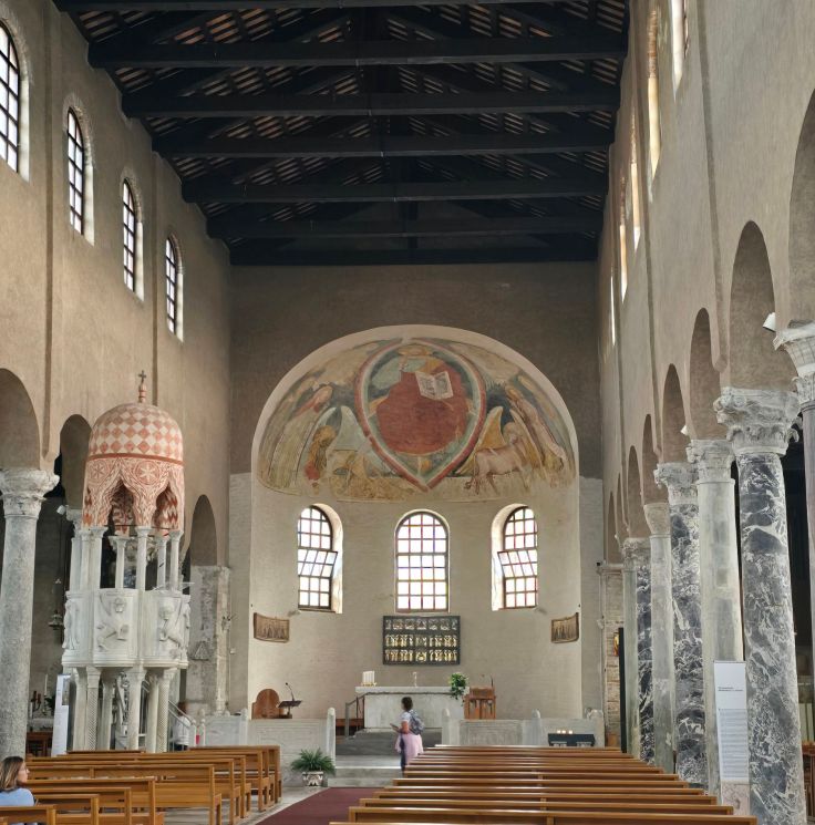 Direkt am Ende der Dammstraße, aber auch innerhalb des Städtchens selbst, gibt es zahlreiche gebührenpflichtige Parkplätze. Wir parken am Westzipfel der Insel, in der Nähe des passenderweise „Key West“ genannten kleinen Strandcafés. Um es vorweg zu nehmen: Dieser Strandabschnitt ist bewirtschaftet, aber auch frei zugänglich, was östlich der Altstadt nicht der Fall ist. Doch uns zieht es zunächst in das Gassengewirr der Altstadt. Mittelpunkt ist die sehr sehenswerte Hauptkirche, die Basilica Sant’Eufemia, zu erkennen am Campanile, von wo aus der Erzengel Michael über die Stadt wacht. Im Inneren finden wir wunderschöne Mosaiken vor, neben zahlreichen Tier- und Pflanzenbildern und Ornamenten sind vor allem die Inschriften von Stiftern abgebildet, die Kanzel mutet maurisch an. Neben der Basilika befindet sich die achteckige Taufkapelle sowie eine weitere Kirche, die Chiesa Santa Maria delle Grazie. Danach schlendern wir ausgiebig durch das wunderhübsche Altstädtchen, in dessen verwinkelte Gassen wir uns gerne verlieren!