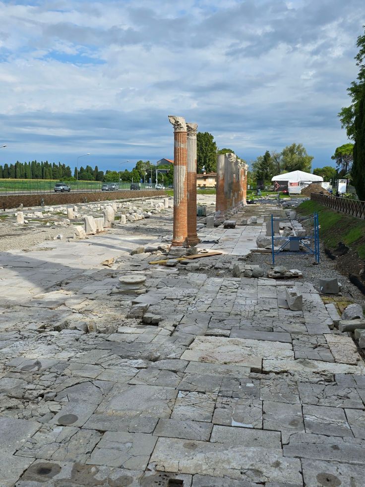 Vor Ort umgesetzt heißt das: Wir parken zunächst (kostenlos) am südlichen Ortsende in der Via Grandi, näher am Geschehen wird es kostenpflichtig, und laufen einfach los. Nach wenigen Minuten passieren wir das Archäologische Nationalmuseum (das wir zum Abschluss besuchen), kurz darauf die erste Ausgrabungsstätte, Fondo Cal (Eintritt frei). Es handelt sich um römische Villen mit hübschen Bodenmosaiken. Woanders wäre dies eine eigenständige Attraktion, in Aquileia läuft man da halt so durch, weil es auf dem Weg zu den „Hauptattraktionen“ liegt. Eine davon haben wir schon bei der Ortsdurchfahrt gesehen und da begeben wir uns auch als nächstes hin: zum Forum Romanum. Wie in Rom bildete dieser Platz das Herz des politischen, administrativen und gesellschaftlichen Lebens der Stadt. Der mit Marmor gepflasterte Platz war an mehreren Seiten von Kolonnaden oder Portiken umgeben, von denen eine Säulenreihe noch steht (bzw. wieder aufgerichtet wurde). Noch längst ist nicht alles hier erforscht, tagsüber sind Archäologen bei der Arbeit zu bestaunen.
