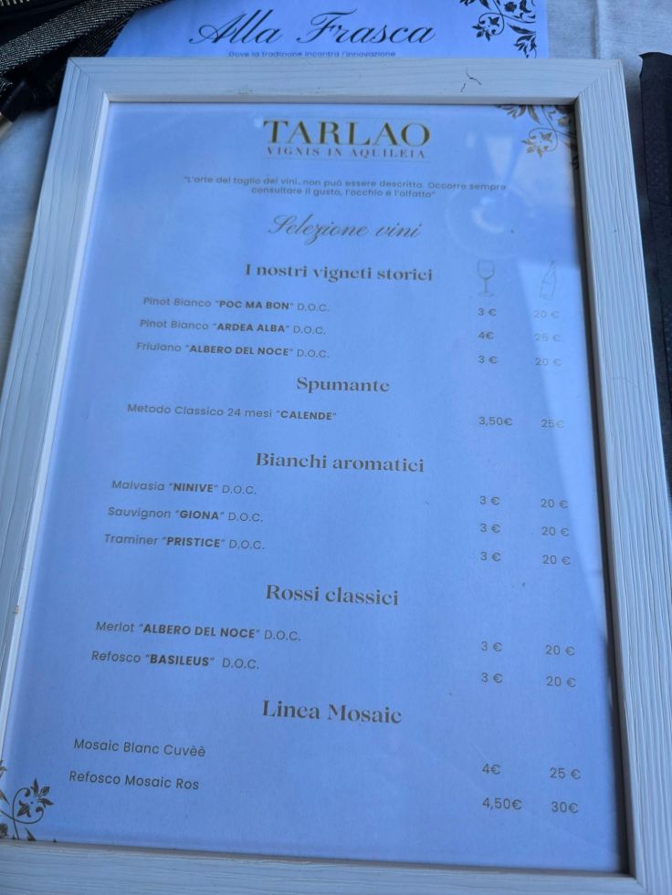 Zum Abschluss dieses Blogs zwei noch wirklich besuchenswerte Restaurants: Das „Al Granaio“ und das „Tarlao Roberto„. Beide liegen malerisch in den Weinbergen in der Umgebung von Aquileia, beide lohnen definitiv einen Besuch. Geboten werden – nebst gutem Wein natürlich – bei beiden regionale Gerichte. Im Al Granaio ist „fine dining“ angesagt, im Tarlao Roberto geht es bodenständiger und günstiger zu, samt selbst gezapftem Gratis-Quellwasser zum Essen. Beide sind absolut empfehlenswert!