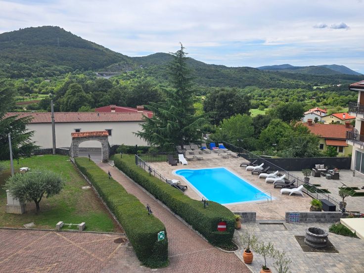 Schon nach wenigen Kilometern überqueren wir die Grenze (praktischer Tipp: Vergesst nicht, eine slowenische e-Vignette zu kaufen, online über DARS oder über ADAC-Geschäftsstellen) und beziehen Quartier in einem Dorf bei Sezana. Vom Balkon unseres netten und verkehrsgünstig gelegenen Boutique-Hotel Grahor (mit dem besten Frühstück unseres gesamten Urlaubs) blicken wir in eine grüne, hügelige Landschaft voller Wälder, Wiesen und kleinen Dörfern.