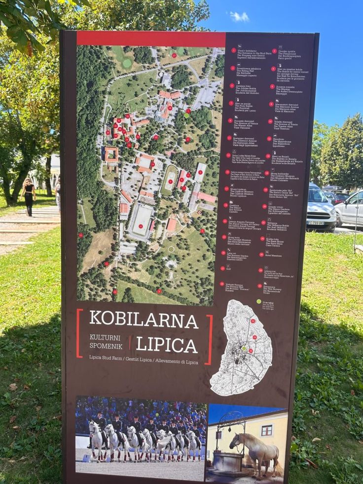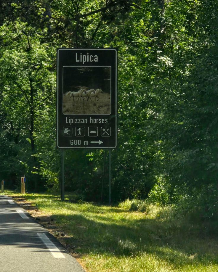 Lipica liegt in der Nachbarschaft von Sezana unweit der slowenisch-italienischen Grenze. Die zahlreichen Hinweisschilder sind kaum zu verfehlen. Einer hübschen Allee folgend, landen wir alsbald auf einem (kostenpflichtigen) Parkplatz vor dem Gestüt. Ein großes Hinweisschild verrät uns, was es hier alles gibt: diverse Koppeln, Ställe, Reithallen, ein Hippodrom, Museen. Ferner eine Infrastruktur für das zu erwartende Publikum: ein Golfplatz, Tennisplätze, Restaurants, ein Kasino. Für das Gestüt können Tickets erworben werden für allgemeine Führungen, zur Besichtigung des Trainings und/oder zu Aufführungen der Reitschule. Nun ja, ich (und auch die übrigen Familienmitglieder) sind keine so großen Pferdefans und wir lassen daher alles Kostenpflichtige links liegen. Lieber laufen wir ein Stück die Koppeln entlang – und das hat mich dann doch fasziniert. Hunderte weiße Lipizzaner und deren braune Fohlen grasen auf den zahlreichen Koppeln links und rechts der Straße, ein malerisch-friedliches Bild vor dem strahlend blauen Himmel. Und Kontaktfreude kann ich den hübschen Pferdchen auch attestieren – das gefällt mir dann doch ganz gut hier :-).