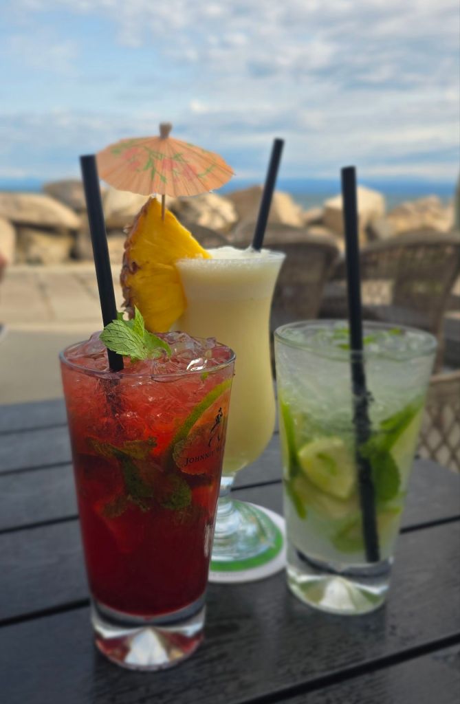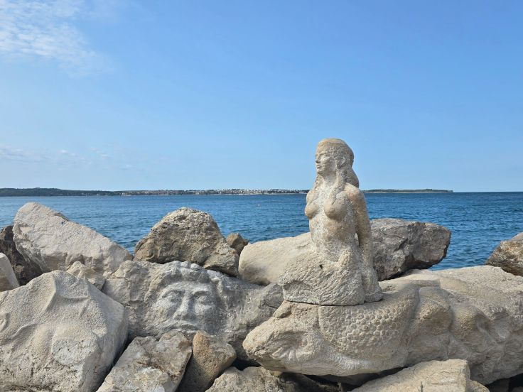 Entlang der Adamiceva Ulica und Pusterla, vorbei an wunderhübsch blühenden Kapernsträuchern und modernem Street Art, geht es hinab zur Uferpromenade. Diese führt einmal um die Landspitze herum, an deren äußersten Ende ein ebenfalls venenzianisch anmutender Leuchtturm (Svetilnik) und die „Piran Meermaid“ stehen. Aber diese moderne Meerjungfrau schaut ja nicht mal auf’s Meer… Das tun wir umso lieber, lassen uns in einem der zahlreichen Cafés und Restaurants nieder und genießen mit C(m)ocktail und Meerblick die Urlaubsstimmung. Ach, ist das herrlich!
