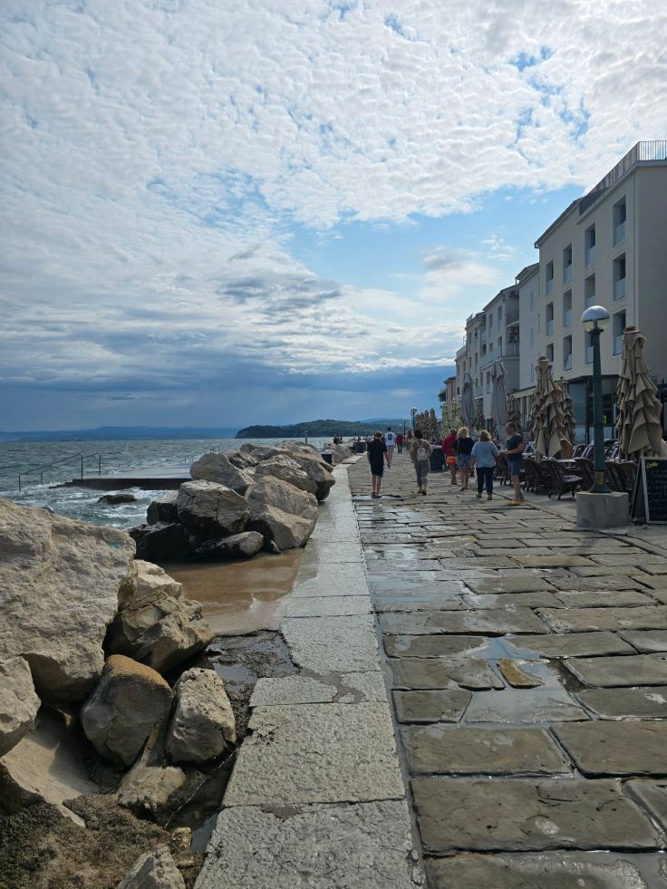 Die Distanzen im Land sind gering und so sind wir in weniger als einer Stunde von Sezana aus an der slowenischen Küste. Die die hügeligen Ausläufer der Dinarischen Alpen reichen bis ans Mittelmeer, die Küste ist felsig. Die Hafenstädte besitzen oft mittelalterliche, venezianisch geprägte Altstädte und mehr oder weniger bedeutende Seehäfen und Marinas. Die Hauptorte sind Koper, Izola und Piran, zu letzterem gehört das Seebad Portoroz mit dem einzig künstlich angelegten Sandstrand des Landes. Piran ist der mit Abstand bekannteste und touristischste Ort und auch unser Hauptziel des Tages.