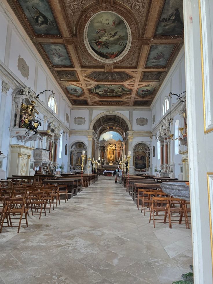 Von der Stadtmauer aus gut zu sehen ist ein weiteres Wahrzeichen der Stadt: die Kathedrale St. Georg mit dem Heiligen Georg, Schutzheiliger der Stadt, auf der Spitze des Kampanile. Er hat eine wunderbare Aussicht auf die drei Länder Slowenien, Kroatien und Italien. Sowohl die Kirche, als auch der Kampanile, kosten Eintritt, allerdings können wir von einem Portal aus durch ein Gitter in die Kirche blicken.