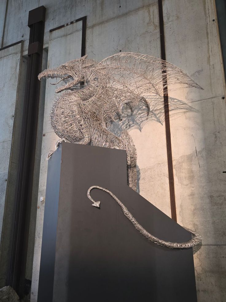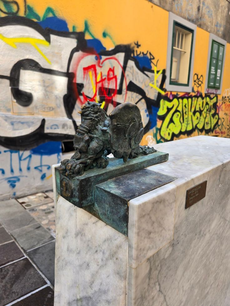 Wir bleiben auf dieser Seite der Ljubljanika und laufen die Trubarjeva Cesta entlang. Hier zeigt sich Ljubljana von einer ganz anderen Seite, schon nach wenigen Metern sind die einfachen Häuser nur noch zwei- bis dreigeschossig, teils nicht renoviert, Second Hand Shops, Imbisse und Graffiti (Street Art will ich es hier eher nicht nennen) prägen das Bild, mittendrin eine Skulptur des slowenischen Bildhauers Janez Boljka. Die besprayten Nebengassen geben immer wieder einen Blick auf die nahe Ljubljanika sowie die gutbürgerlichen Häuser entlang der Uferpromenade frei, ein interessanter Kontrast. Schließlich erreichen wir eines der Wahrzeichen der Stadt: die Drachenbrücke (Zmajski Most). Schon auf den bisherigen Wegen sind uns immer wieder Drachen begegnet, auf den Gullydeckel, in Souvenirshops, als Skulptur, auf Süßigkeiten (Drachen- statt Mozartkugeln!) und der Geselle findet sich auch im Wappen der Stadt. Der Legende nach soll der griechische Held Jason mit seinen Argonauten hier einen Drachen besiegt haben, der sich im Lauf der Zeit zum Beschützer der Stadt gemausert hat. Auf der Drachenbrücke versuchen Scharen von Touristen, ein Selfie allein mit dem furchteinflößenden Wappentier zu machen und bei dem Gedrängel nicht von einem Auto über den Haufen gefahren zu werden.