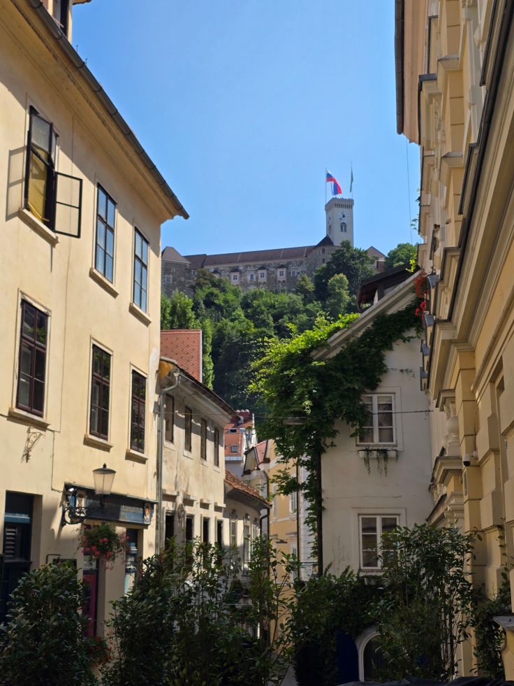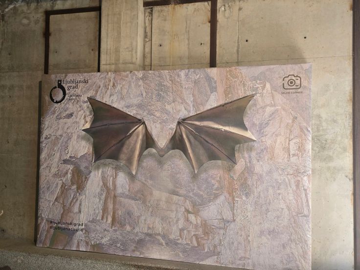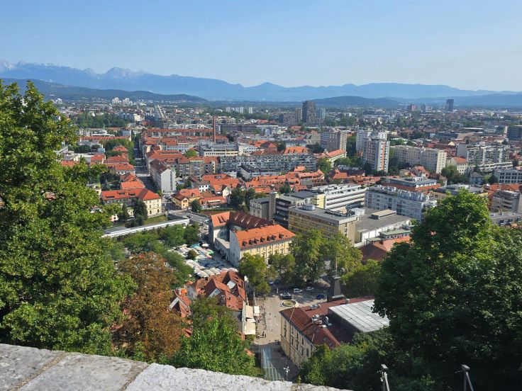 Unsere nächste Station ist die Burg (Ljubljanski Grad), die auf einem Hügel stehend quasi von überall in der Altstadt zu sehen ist. Für mich muss wie immer ein Blick von oben auf eine Stadt einfach sein, hingegen sparen wir uns dieses Mal die Besichtigung der Burg von innen. Nach einer kurzen Fahrt mit der Standseilbahn sind wir oben im Burghof, dekorativer Fotoherzblumenrahmen und besagte Drachen-Selfie-Station sind gratis mit dabei. Von den Burgmauern blicken wir in Stadt und Umland. Erstere begeistert mich von oben – nicht. Rein gar nichts ist von hier aus von der hübschen Stadt zu sehen, es dominieren hässliche Einheitsbauten. Ich bin überrascht, wie unterschiedlich die Eindrücke von unten und von oben sind. Dafür ist das grüne Umland, eingerahmt von den Alpen, umso malerischer.