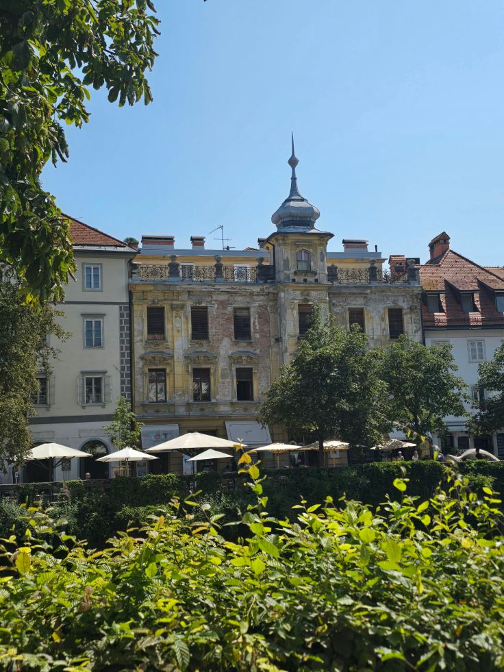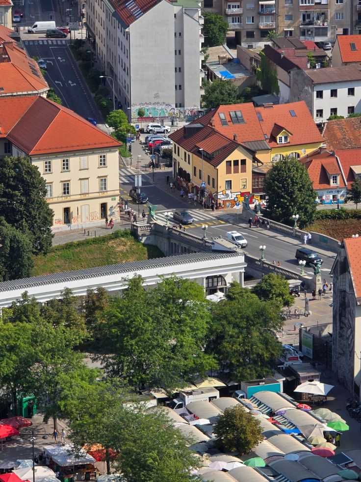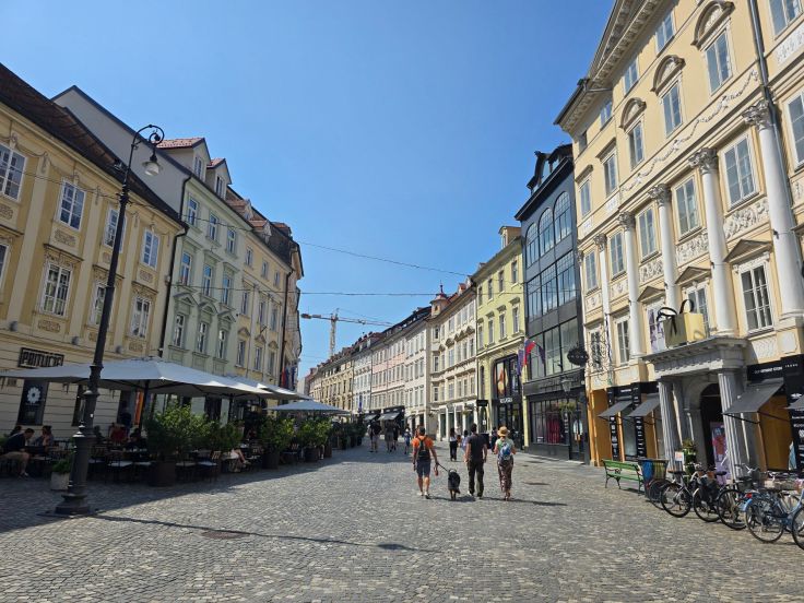 Zu Fuß geht es wieder hinab und weiter durch die Altstadt auf der anderen, östlichen Seite der Ljubljanika. Auf dem Zentralmarkt herrscht wie es sich gehört reges Markttreiben, eine bunte Mischung aus Obst- und Gemüsehändlern und in Richtung Dom St. Nikolaus auch touristisch orientierte, aber hübsche, Handwerkskunst und Kulinarisches. Der Eintritt in den Dom ist leider kostenpflichtig – schade, Eintritt in noch als solche genutzte Gotteshäuser ist in meinen Augen fragwürdig und sorgen bei mir für Verweigerung. Auf dem Stadtplatz (Mestni Trg) stehen neben dem Rathaus weitere barocke Stadtpaläste sowie der Brunnen der drei Krainer Flüsse („Robba-Brunnen“). Von hier aus blicken wir über die „Drei Brücken“ wieder zur rosaroten Franziskanerkirche auf der anderen Flussseite – Plečniks oben erwähnte „Landachse“. Der weitere Weg durch die Fußgängerzone vermittelt uns wie schon in Triest ein bisschen das Gefühl, nicht zu wissen, ob wir in Slowenien, Österreich oder Italien sind. In der Stari Trg wird die Straße enger, es bröckelt mitunter der Putz wie bei der sehr malerischen Slascicarna (Konditorei). Der Herkules-Brunnen markiert das Ende der Einkaufs- und Flaniermeile. Entlang der Uferpromenade, gesäumt von vielen Cafés, geht es wieder zurück.