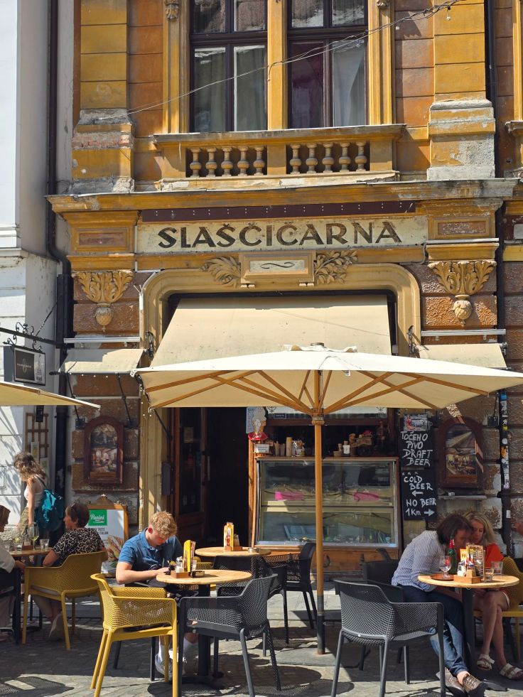 Und abschließend noch ein kulinarischer Tipp: die Slowenen haben wohl Süßspeisen ganz gern (auch das ein österreichisches Erbe?), Konditoreien, Schokoladen- und sonstige Süßwarengeschäfte finden sich überall. Wir können beim Strudelhaus, Moji Struklji, nicht widerstehen. So eine Vielfalt an Strudeln, übrigens nicht nur süß, sondern auch herzhaft, zu einem sehr günstigen Preis, habe ich noch nicht gesehen. Alle waren dazu noch superlecker und für weniger als 5,- Euro (Stand 2025) sind wir sehr satt und zufrieden.