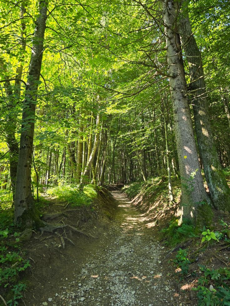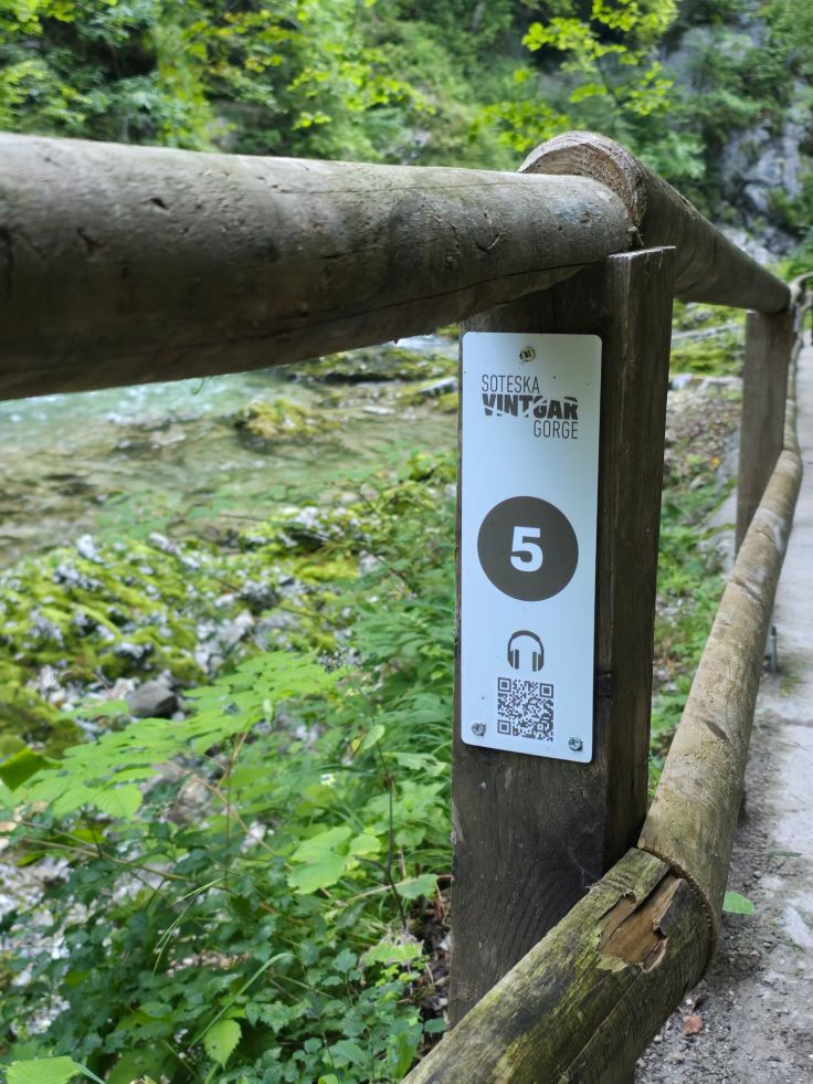 Der Weg durch die Schlucht ist wie gesagt 1,6 Kilometer lang, dauert etwa 45 Minuten und führt über Holzwege. Für Erwachsene und extra für Kinder gibt es mehrere Stationen mit Informationen über den Audioguide. Die Wegstrecke in der mal engeren mal breiteren Klamm mit dem rauschenden Flüsschen ist wirklich toll und beeindruckend! Wir hatten ein bisschen Sorge, dass die Besucherströme die Stimmung verderben, aber die zeitgleich eingelassenen Mitbesucher verteilen sich schnell – wie ihr an den Bildern sehen könnt. Der Weg führt unter anderem unter der Bohinjer Eisenbahnbrücke (wenn ihr Glück habt, kommt ein Zug – hatten wir nicht) hindurch und endet schließlich an den Šum Wasserfällen. Wer Durst oder Hunger hat, kann sich hier nochmal verpflegen, alle geben ihre Helme ab und weiter geht es auf verschiedenen Wegen zurück zum Ausgangspunkt. Wir wenden uns nach links über die Brücke und laufen den „Rivers of Trees-Trail“ (rechts führt der etwas längere „King of Triglav-Trail“ wieder zurück). Vorbei an Weideflächen und Streuobstwiesen, später im Wald, ist der Weg schön und abwechslungsreich, der Audioguide vermittelt vertiefende Informationen. Außer uns ist seltsamerweise nur eine weitere Familie unterwegs und wir fragen uns, wo alle abgeblieben sind – vielleicht alle beim „King of Triglav“? Trotz der zu Beginn etwas verwirrenden Beschilderung landen wir schließlich nach 4,3 Kilometern wieder am Visitor Center und nehmen von dort den Shuttle zum P1-Parkplatz. Unser Fazit: Lasst euch nicht von den Besuchermassen am Visitor Center abschrecken! Selbst in der Hochsaison verlaufen sich die vielen Menschen schnell und die Vintgar Klamm ist wirklich einen Besuch wert!