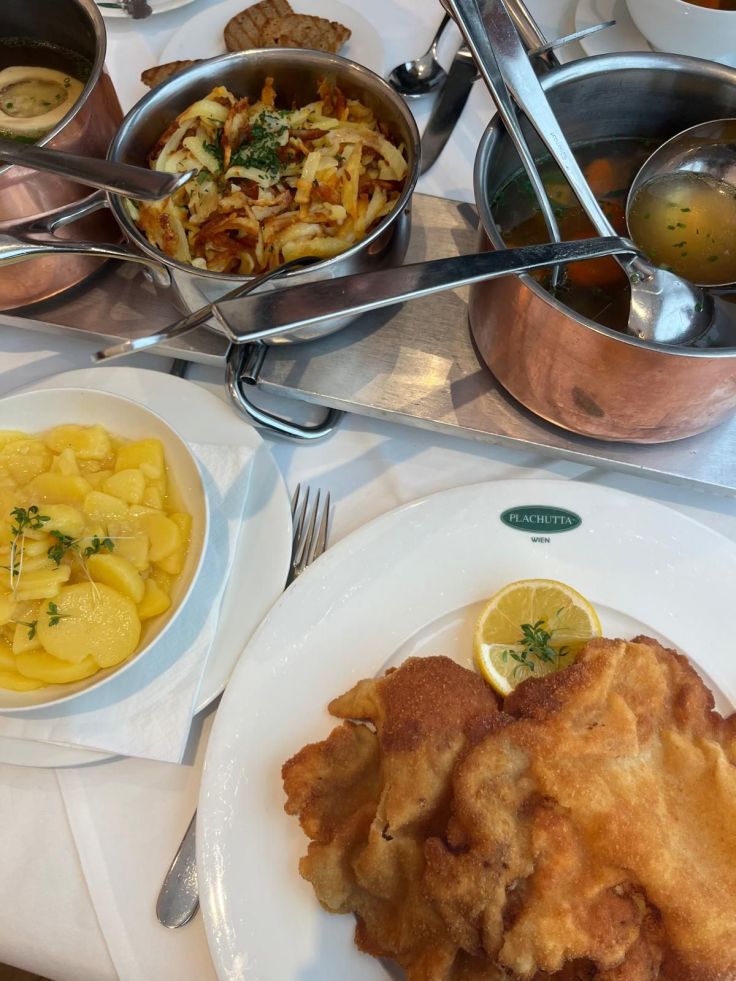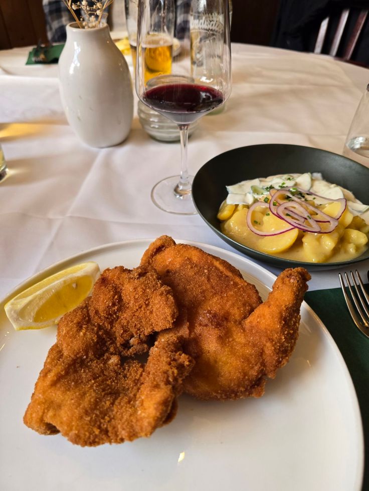 Köstlich im Plachutta war auch das Wiener Schnitzel, natürlich vom Kalbfleisch (alles andere ist nicht echt), innen perfekt zart und mit einer unglaublich krossen, „aufgeplusterten“ Panade. Ein Traum. Ebenso herrlich war der „schlonzige“ Kartoffelsalat (hochdeutsch: glänzig-saftig), mit Brühe und Öl zubereitet und bloß nicht mit Mayonnaise, da sind sich Österreicher und Schwaben einig!