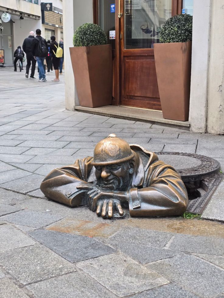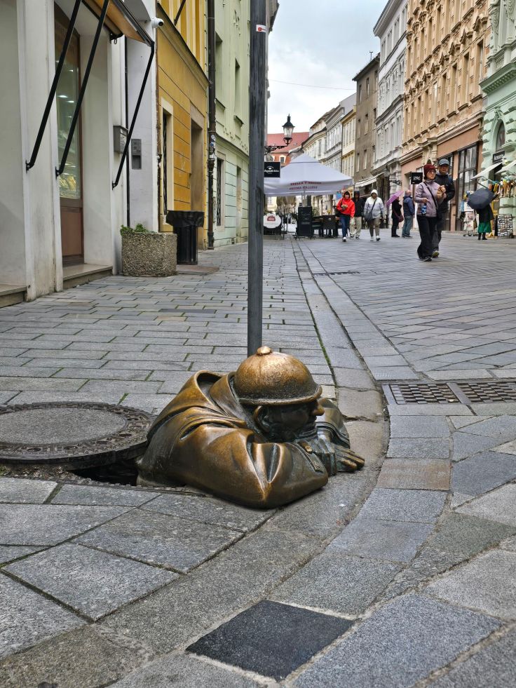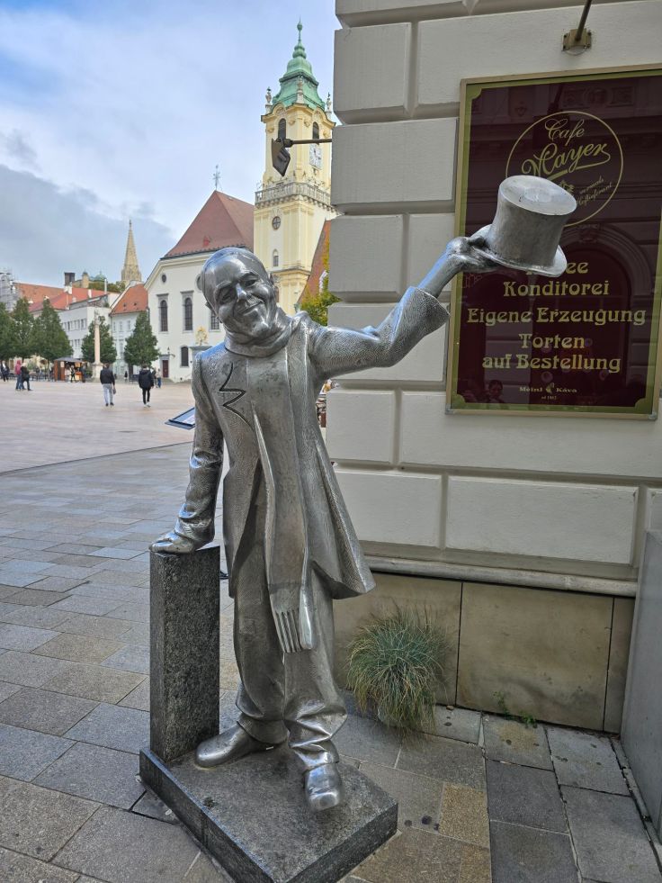Am Hauptplatz „begegnet“ uns auch die erste von mehreren Skulpturen, die die Stadt zieren, sie zählen zu den meistfotografierten Attraktionen Bratislavas und wurden im letzten Jahrzehnt des 20. Jahrhunderts geschaffen. Über eine Bank beugt sich Napoleons Soldat von Juraj Melis. Unweit davon, an einer Ecke des Hauptplatzes in der Straße Rybárska brána, steht eine weitere Skulptur, der Schöne Náci (mit bürgerlichem Namen Ignác Lamár) vor dem Cafè Mayer. Am bekanntesten ist die Skulptur Čumil (auf Deutsch: Gaffer oder Gucker) von Viktor Hulík, an der Kreuzung Rybárska brána/Laurinská, ein aus einem Kanaldeckel „guckender“ Arbeiter.