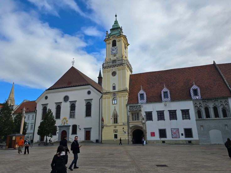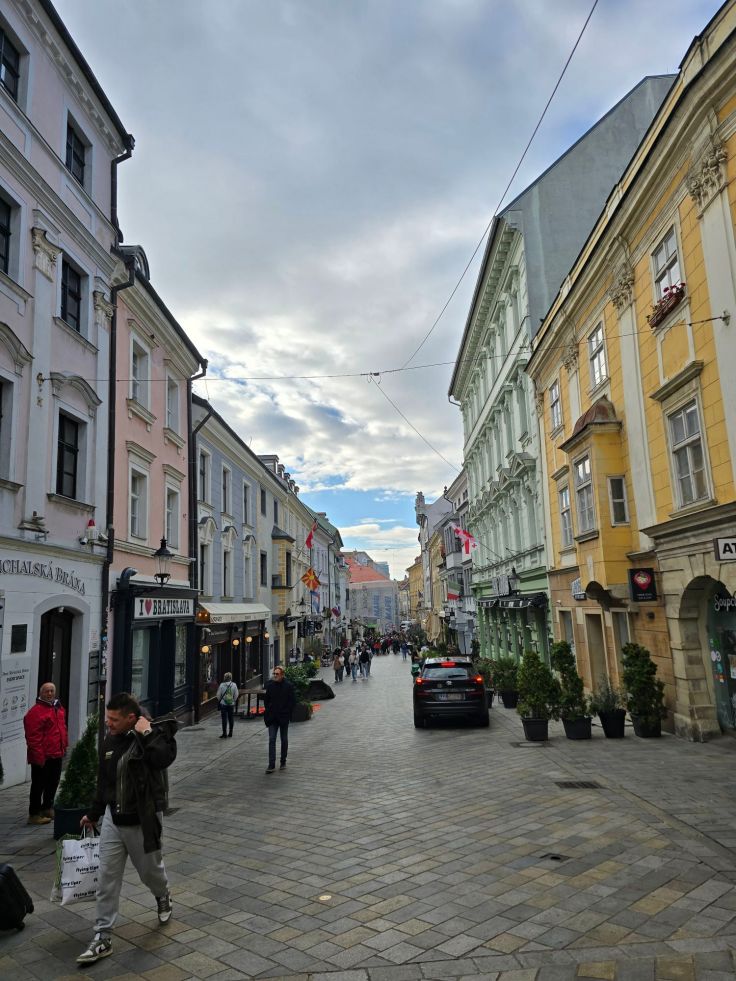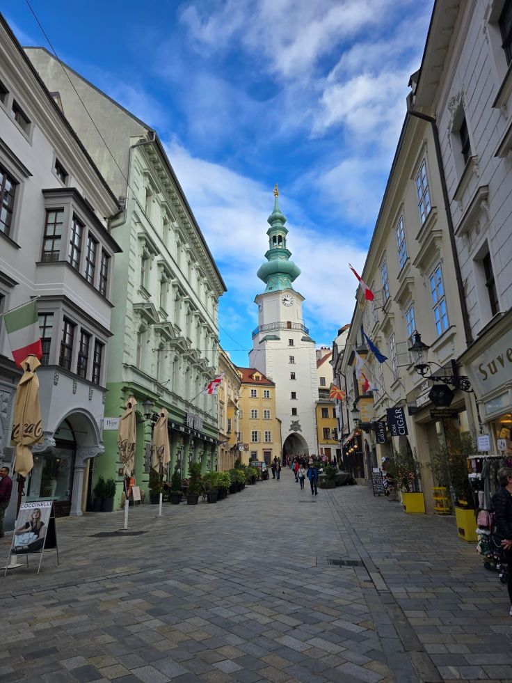 Durch das barocke Michaelertor (Michalská brána) gelangen wir in die Altstadt, das Bauwerk sieht aus der Ferne eher wie ein Kirchturm als ein Tor aus. Es ist das einzige noch erhaltene von einst vier Toren der mittelalterlichen Stadtbefestigung. Dahinter beginnt der touristische Teil der Fußgängerzone, hübsch herausgeputzt und an unserem Besuchstag belagert von mehreren Ausflugsgruppen der Donaukreuzfahrtschiffe.