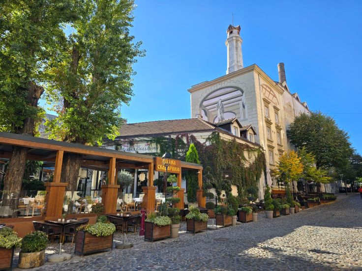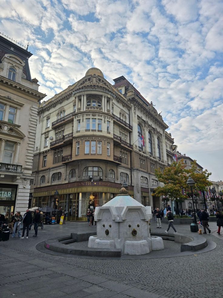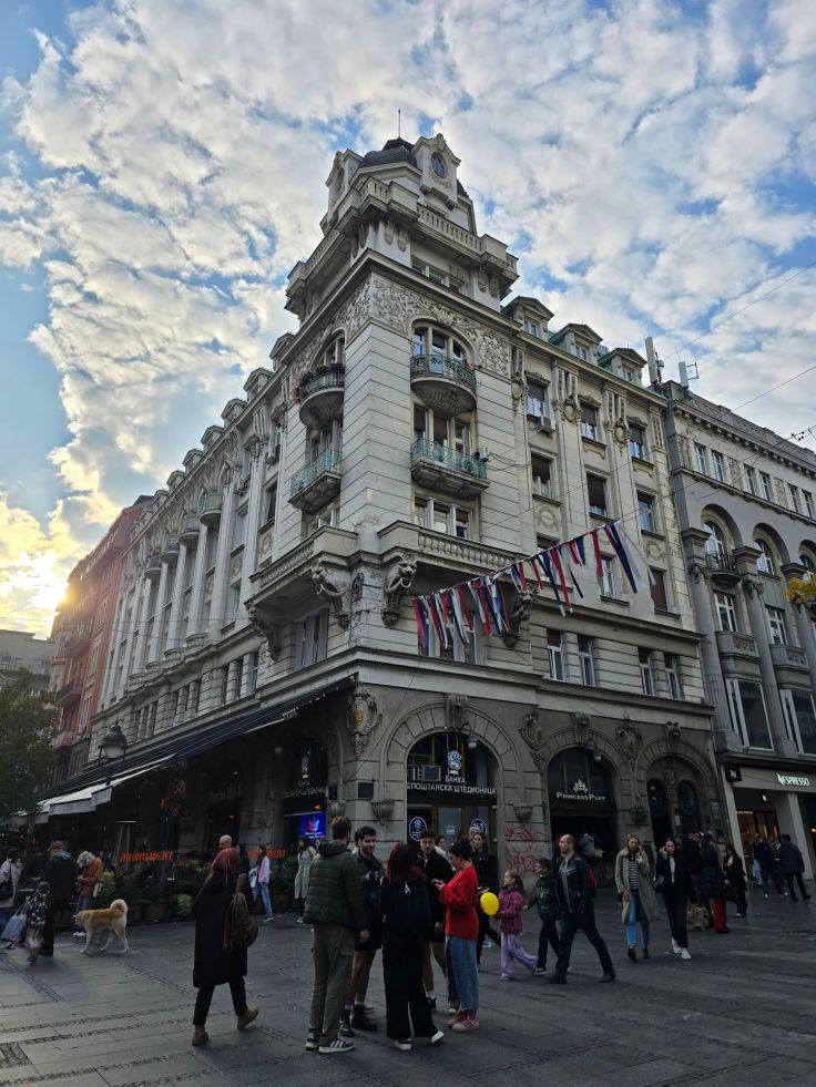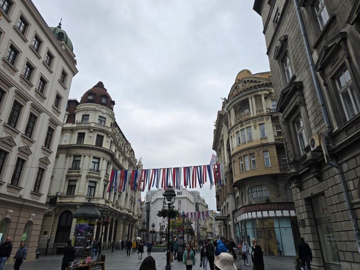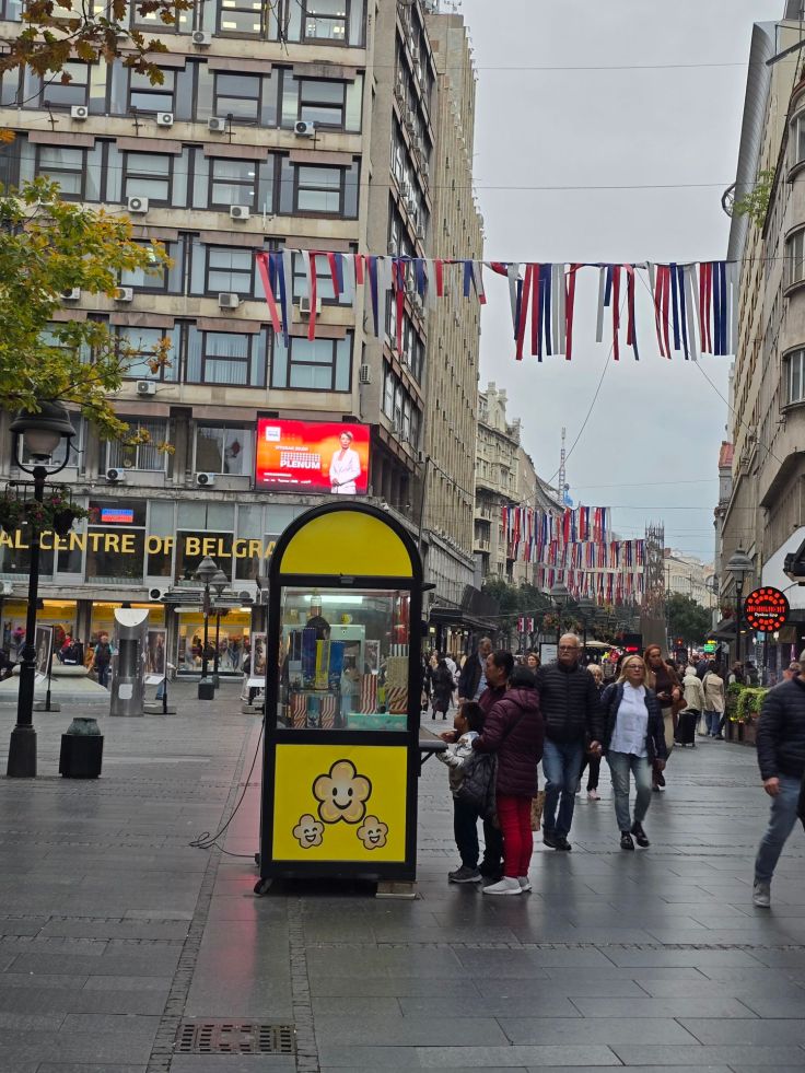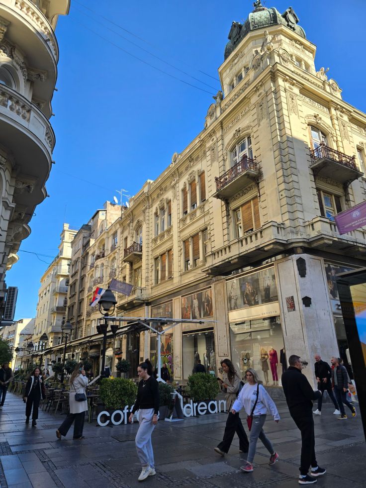 Danach starten wir die Stadterkundung, wir übernachten ja praktischerweise „mitten drin“. Die Kneza Mihaila (auch Knez Mihailova genannt) ist die Haupteinkaufsstraße der Stadt. Hier finden sich zum einen wunderschön sanierte bürgerliche Stadtpaläste neben gesichtsloser sozialistischer Zweckarchitektur und vereinzelt dem Verfall preisgegebene Gebäude. Es überwiegt jedoch bei weitem der „gute Eindruck“, der durch das quirlige Treiben und viele Flanierende nochmals positiv verstärkt wird. Das Warenangebot ist bunt gemischt, neben vielen international bekannten Marken finden sich auch uns unbekannte, offenbar serbische, Marken sowie, vor allem in den Nebenstraßen, viele Cafés. Auffällig ist, dass alle 100 Meter ein Popcorn-Stand steht – das scheint der Lieblingssnack der Belgrader zu sein. Wir holen uns an einer der Straßenbars einen Aperol Spritz und eine Matcha Latte – zusammen für umgerechnet weniger als 7 Euro, wohlgemerkt in der Haupteinkaufsstraße!