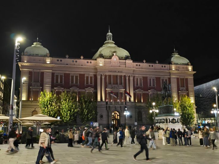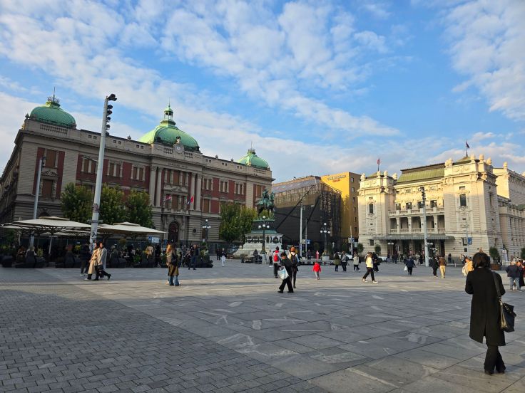 Am einen Ende der Fußgängerzone liegt der Platz der Republik (Trg Republike). Dieser zentrale Platz ist bei Tag und Nacht Treffpunkt der Einheimischen und Startpunkt fast aller Stadtführungen. Auffälligstes Gebäude ist das Serbische Nationalmuseum, vor dem die Statue des Prinzen Mihailo (Obrenovic) steht. Der Prinz ist uns schon in der Fußgängerzone „begegnet“, die nach ihm benannt wurde. Er ist ein serbischer Nationalheld, da er das Land durch erfolgreiche Verhandlungen mit den Osmanen 1867 in die Unabhängigkeit führte und anschließend durch Reformen modernisierte. Er hat auch das Nationaltheater gegründet, das ebenfalls an diesem Platz steht.