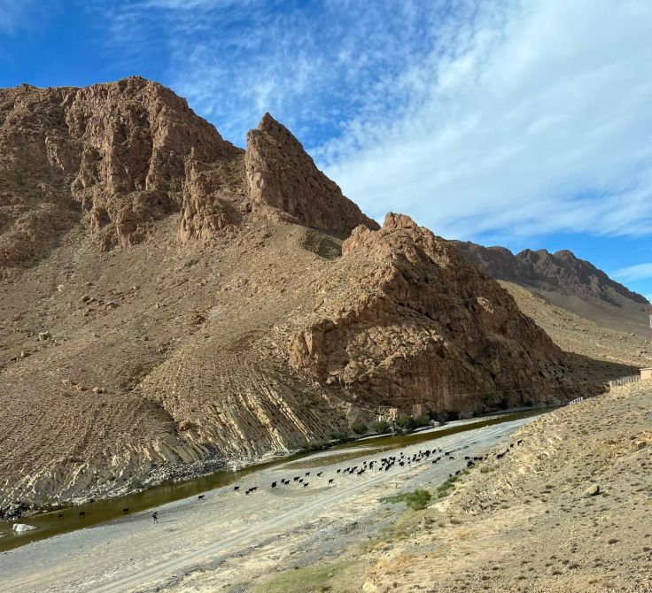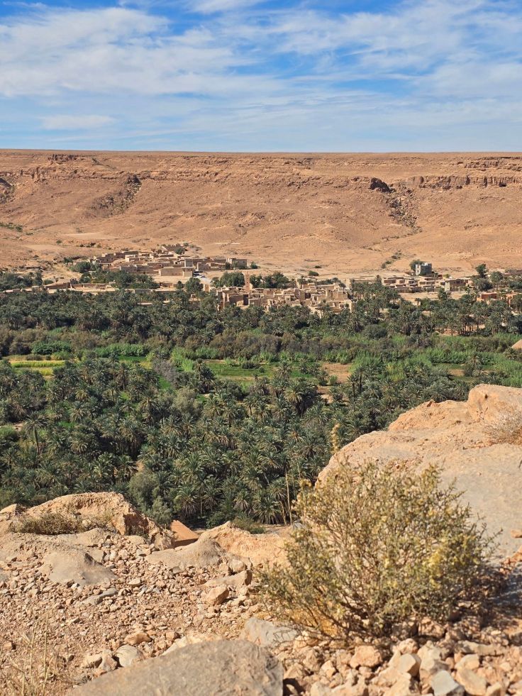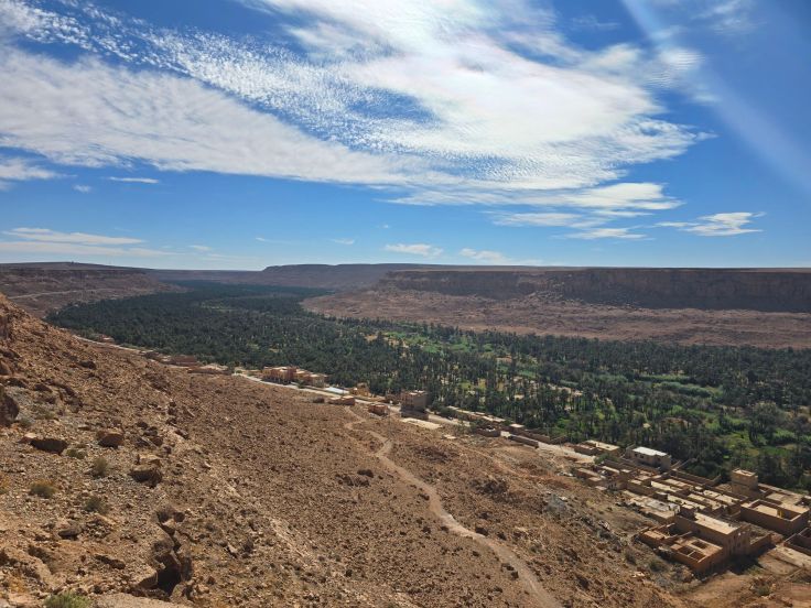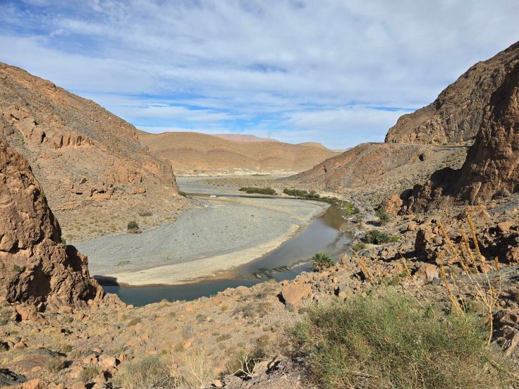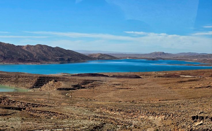 Von Midelt bis Erfoud fahren wir durch den Hohen Atlas größtenteils entlang des Flusses Ziz. Hinter dem Zaabal-Tunnel machen wir Halt, um den Flusscanyon zu bewundern. Danach bietet die Straße (N13) immer wieder tolle Ausblicke auf den Fluss und in die Bergwelt. Sie führt vorbei an einem der größten Stauseen Marokkos, dem Stausee Hassan Addakhil (Barrage Al Hassan Addakhil). Türkisblau schimmert sein Wasser in der rotbraunen, wüstenhaften Umgebung, ein toller Anblick. Ebenso schön ist der Ausblick auf die Flussoasen des Ziz – immer wieder halten wir an einem der vielen Aussichtspunkte und genießen den Kontrast zwischen dem Grün der Palmen und sonstiger Gewächse sowie der sandfarbenen Umgebung.