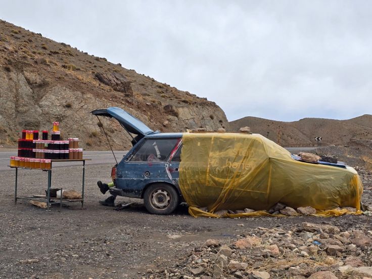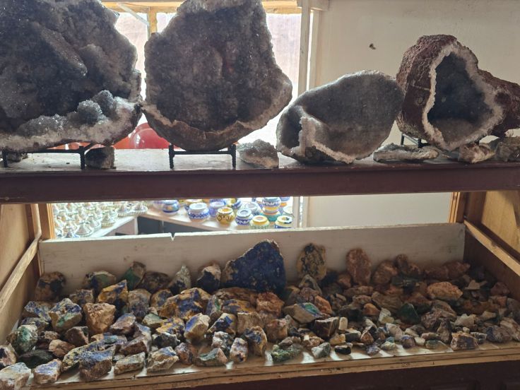 Nachdem wir die folgenden Tage südlich des Hohen Atlas im Saharavorland verbracht haben (Blogs folgen), führt unser Rückweg am Ende der Reise erneut durch den Hohen Atlas, von Ouarzazate/Ait Ben Haddou bis nach Marrakesch. Die ebenfalls sehr gut ausgebaute N9 hat ihren höchsten Punkt am Tizi Tichka-Pass auf 2.260 Metern Höhe. Obwohl die Straße höherliegt als die östlicher verlaufende N13, erscheint die Umgebung grüner, bewaldeter, stellenweise wird aufgeforstet. Oben auf der Passhöhe und auch immer wieder entlang der Straße bieten Mineralien- und Fossilienhändler ihre Waren an: Amethyst- und Quarzdrusen, Gipsmineralien wie Alabaster, Kupfermineralien wie Azurite und Malachite, Trilobite und Ammonite, um nur einige zu nennen. Sammler kommen hier voll auf ihre Kosten und auch ich erinnere mich daran, wie mein Geologen-Vater vor über 30 Jahren in dieser Gegend hübsche Stücke erstanden hat. Wir halten an mehreren Aussichtspunkten, um Landschaft und den Blick auf die Bergdörfer zu genießen.