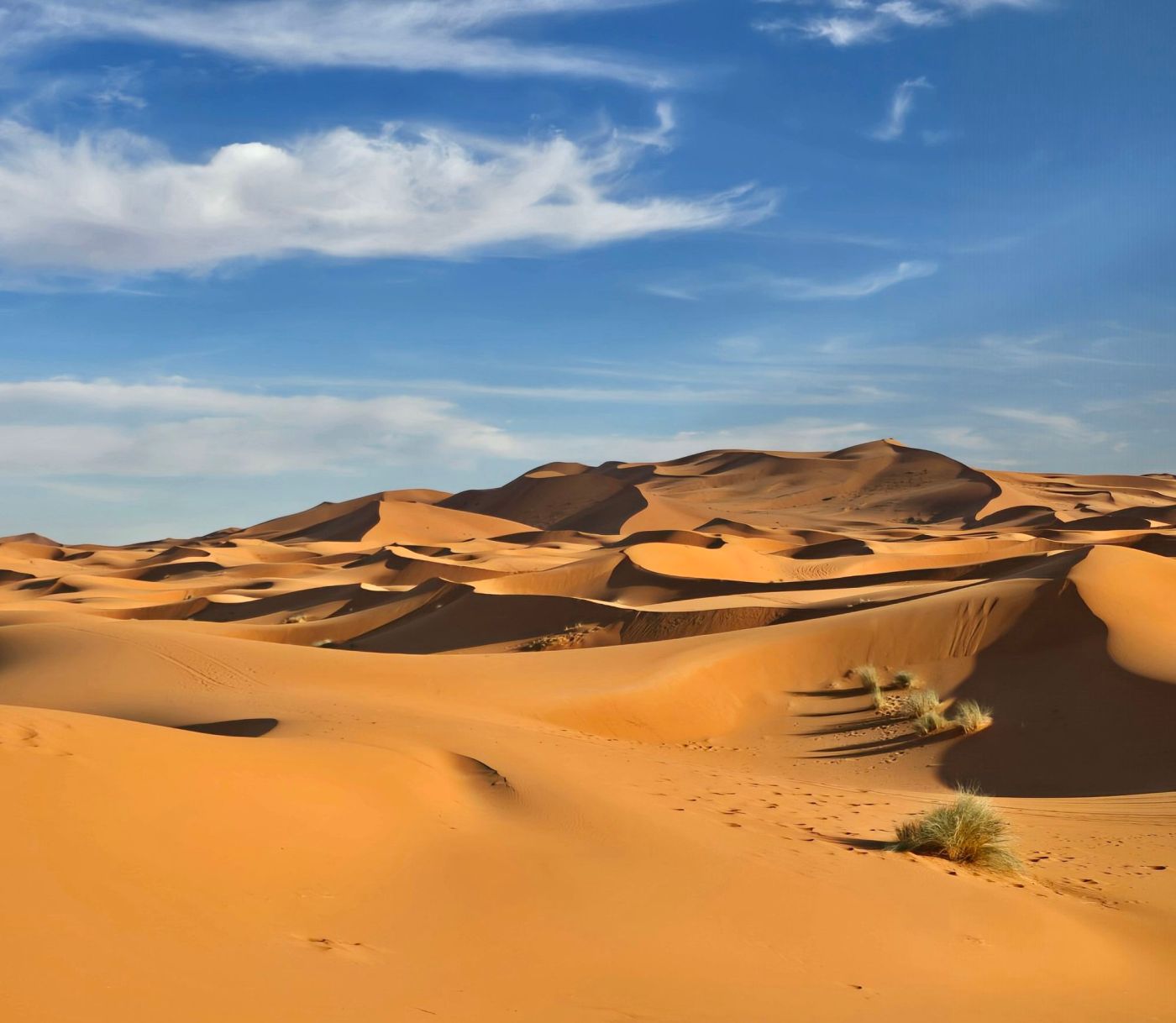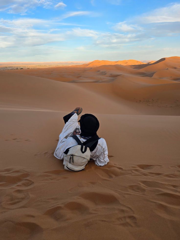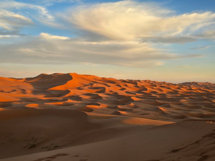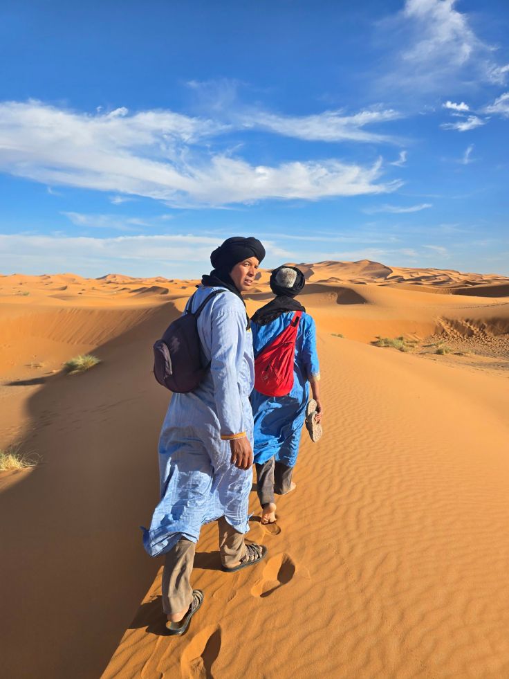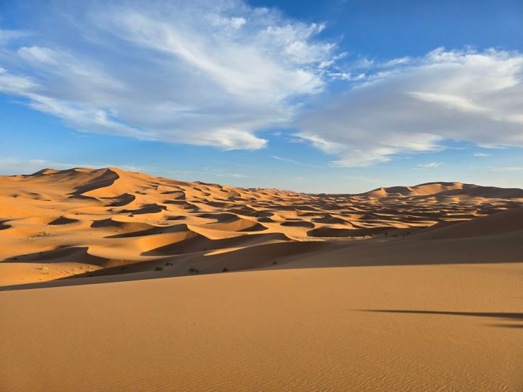 Der Erg Chebbi ist eine Sanddünenlandschaft mit teils über 150 Meter hohen Sandbergen, über 20 Kilometer lang und 5 Kilometer breit. Diese Größe des Gebiets stellt sicher, dass trotz zahlreicher Touristengruppen rings um das Dünengebiet noch ein gewisses „Wir-sind-allein-in einer-großartigen-Landschaft-unterwegs-Gefühl“ aufkommt. Zumindest, wenn ihr euch (mit Führer!) ein stückweit in die Sandwüste begebt.