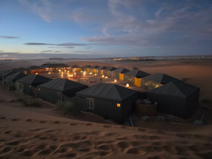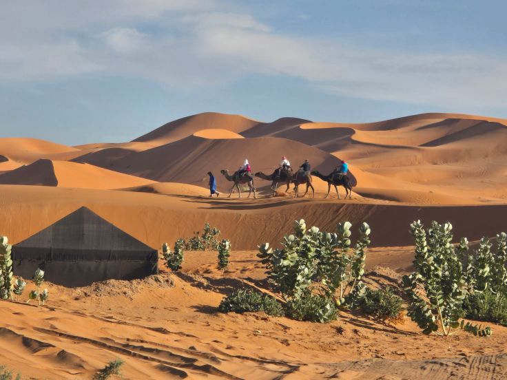 Am Fuß der Dünen liegen ein paar Camps (wir starten am La Belle Etoile Xaluca) – da kommt noch kein richtiges Wüstenfeeling auf. Das ändert sich jedoch sofort, als wir im Gänsemarsch hinter unseren Guides in die Sandberge laufen und der Zivilisation im wahrsten Sinne des Wortes den Rücken kehren: Vor uns nur endlose Sandberge und – sehr malerisch – vereinzelte Kleingruppen, die sich wie wir zu Fuß oder auf Dromedaren ihren Weg durch den Sand bahnen.