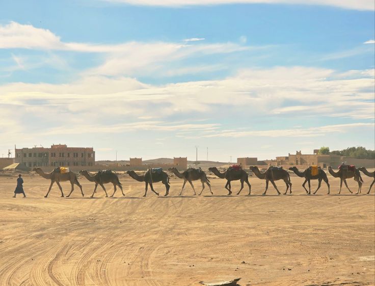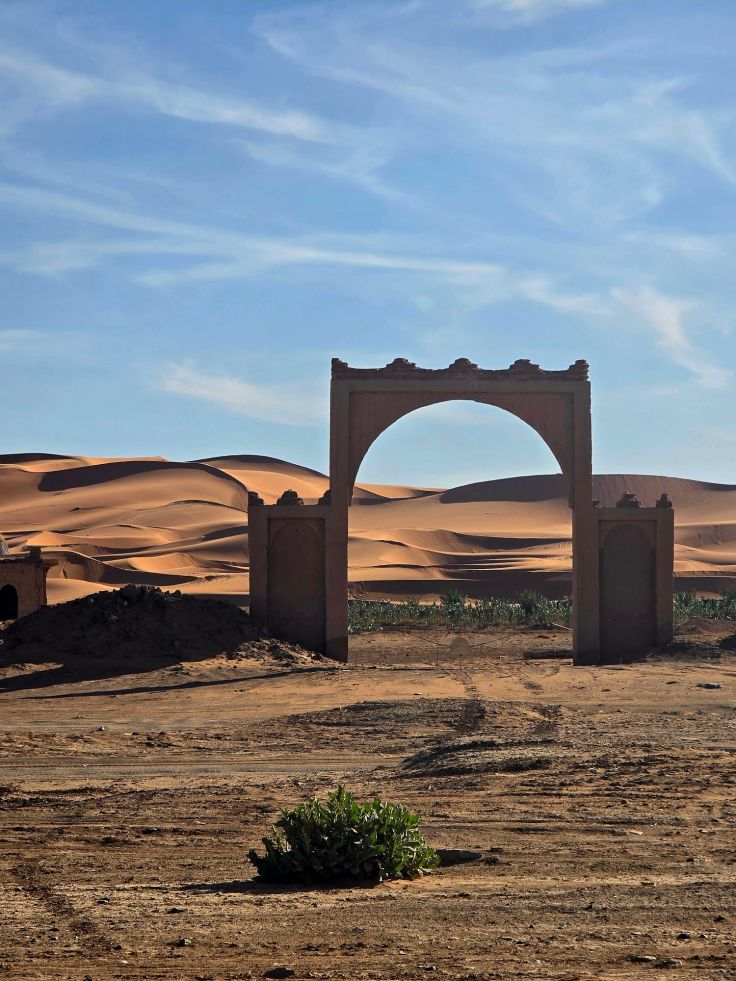 Wir werden in unserem Hotel mit 4×4-Jeeps abgeholt und zunächst über eine geteerte Straße, dann über eine Steinwüstenlandschaft gefahren, bis wir in der Ferne die Dünen sehen. Von dort bewegen wir uns zu Fuß auf die Dünen zu, vorbei an Toren ins Nirgendwo, Wüstencamps und Dromedar-Herden auf ihrem Weg zur Arbeit…