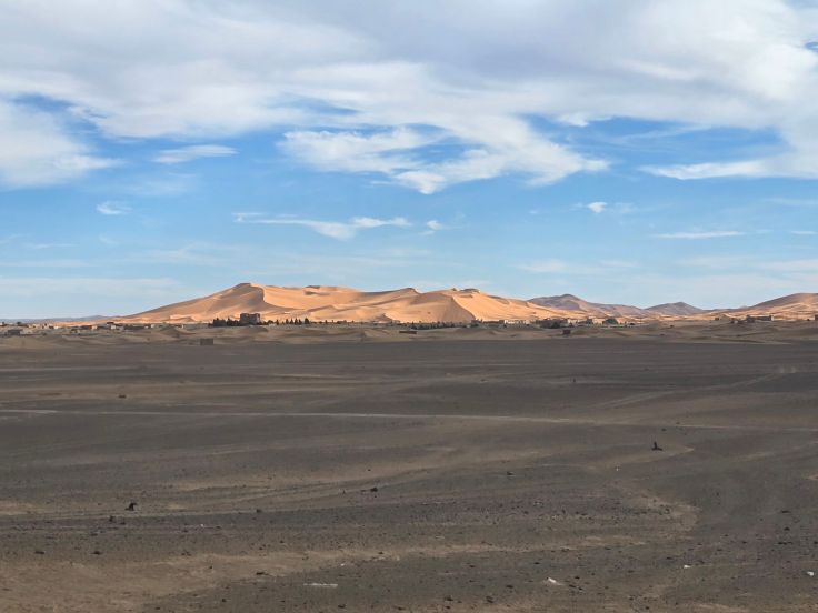 Um dorthin zu gelangen, müssen wir ganz schön weit fahren: Über diverse Atlas-Gebirge, über Hochebenen und karge Geröllwüstengebiete, bis zu den Kleinstädten Erfoud oder Merzouga, nur etwa 50 Kilometer vor der algerischen Grenze im Südosten Marokkos. Von dort aus ist es nicht weit zum Erg Chebbi.