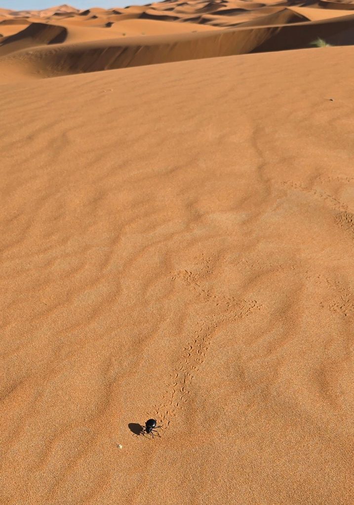 Schon bald sehen wir nur noch unsere kleine Karawane, den Sand, ein paar vereinzelte Gräser und – Mistkäfer. Die sind leicht und sinken nicht ein, im Gegensatz zu uns. Wir sind schwer damit beschäftigt, die immer höher werdenden Dünen zu erklimmen: Ein Schritt vor, ein halber zurück, Sand im Schuh. Nicht unanstrengend, die Tour. So manch eine/r macht es wie unser Guide und läuft barfuß im warmen Sand. Oben angekommen, dürfen wir uns ausruhen und können die großartige Umgebung so richtig genießen: Sand, so weit das Auge reicht, die untergehende Sonne lässt die Dünen rot glühen, die Schatten werden immer länger. Einfach nur unfassbar schön!