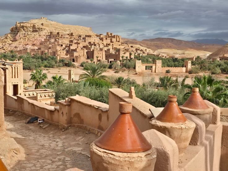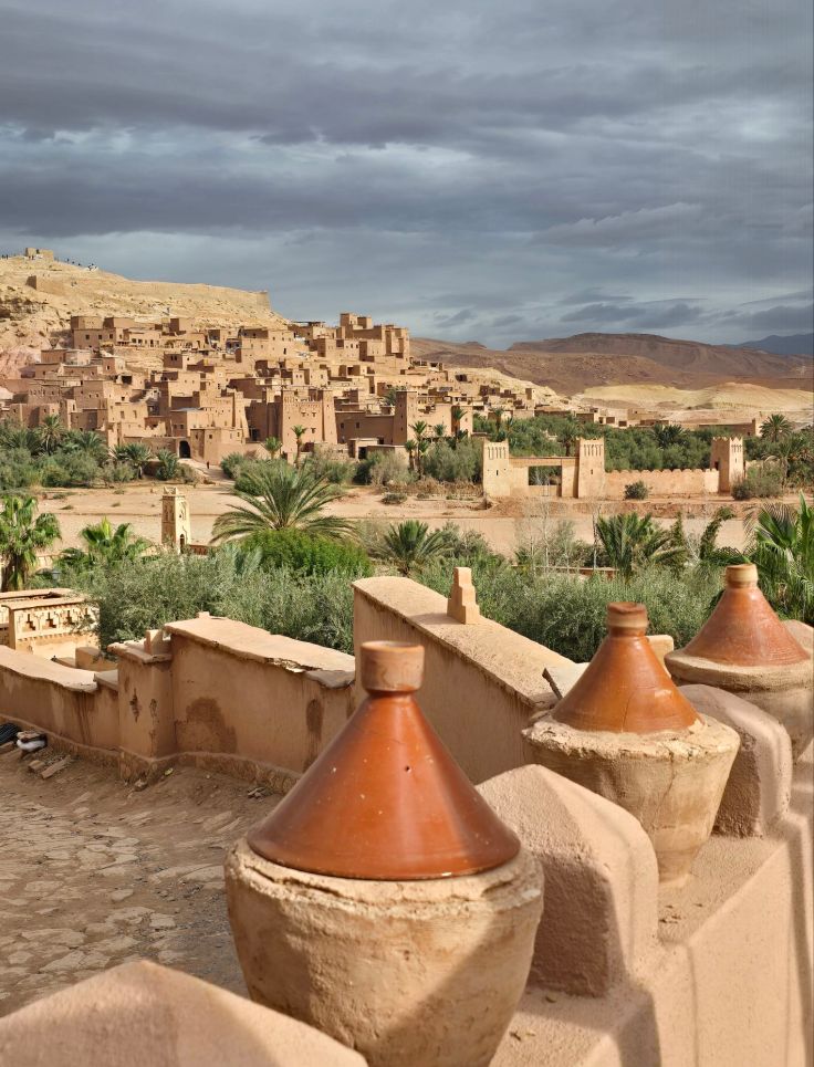 Die meisten Touristengruppen starten ihren Besuch vom Aussichtspunkt „Pointe Vue Panoramique“ an der Straße P1506. Hier hat man allerdings auch die Neustadt im Bild, weshalb ich für ein Foto empfehle, etwas weiter westlich die schmale Gasse am „Café Restaurant La Kasbah Ait Ben Haddou“ hinunterzulaufen und von hier aus, ohne störende Neubauten, die historische Siedlung zu fotografieren. Samt malerisch verteilter Tajine-Gefäße auf der Mauer und Oasenkultur im Vordergrund. Und – Seltenheitswert! – Gewitterstimmung am Himmel, es fallen sogar ein paar Tropfen Regen. Anschließend überqueren wir das meist ausgetrocknete Flussbett des Asif Mellah und laufen durch Olivenhaine bis zum Eingangstor des Ksar.
