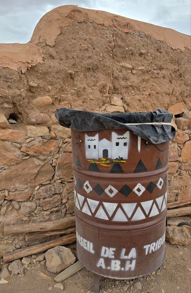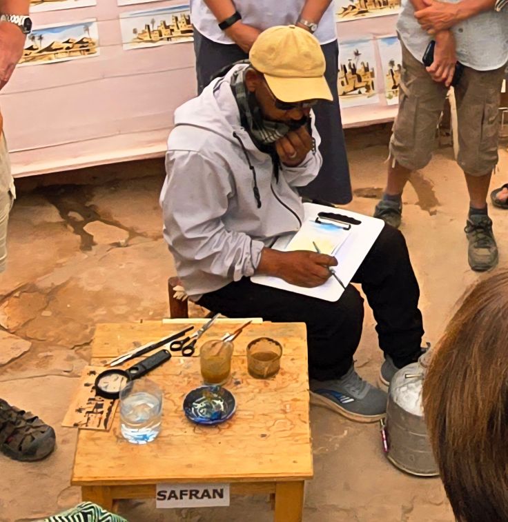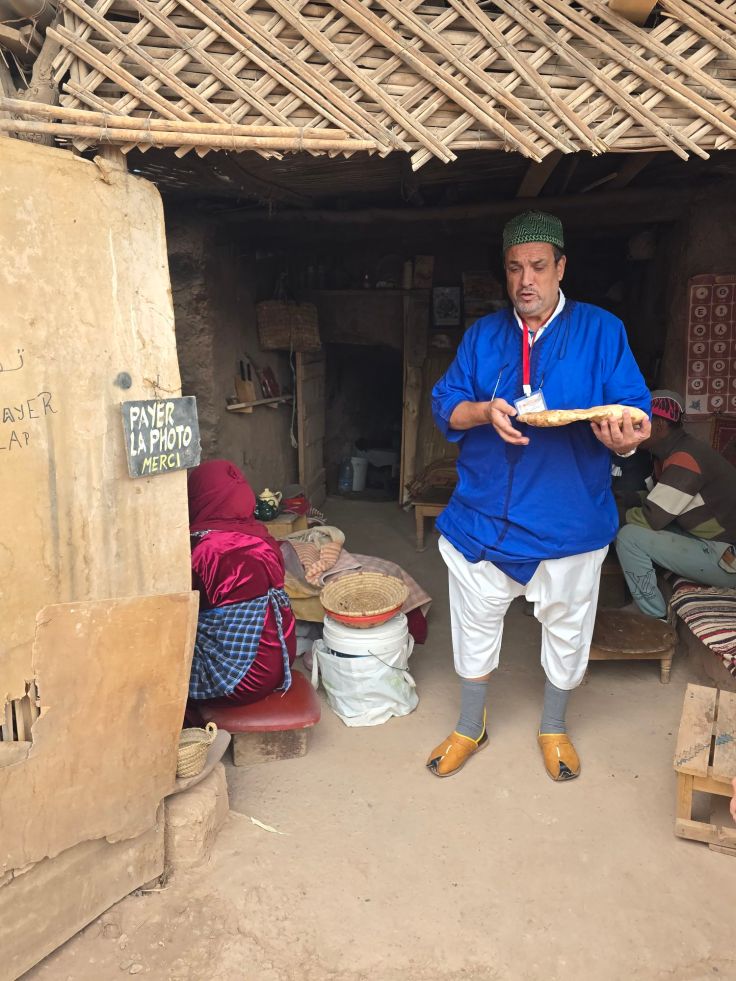 Spätestens jetzt sind wir voll in der Vermarktungsindustrie angekommen. Noch vor dem Eingangstor empfängt uns eine Amazigh (Berberfrau), die Brot bäckt. Unser Guide Mohammed kauft eines und es schmeckt großartig. Im Ort wird weitere Handwerkskunst präsentiert, wie die sehr interessante „Feuermalerei“: Für die Farbgebung sorgen Tee (mit und ohne Zucker), Safran und Indigo in Wasser aufgelöst und mit Pinsel aufgetragen, über einer Gasflamme „geröstet“ entstehen wie von Zauberhand hübsche Kunstwerke. Kenne ich noch aus Kindertagen als Geheimschrift aus Zitronensäure, nur konnte man meine Werke bestenfalls lesen…