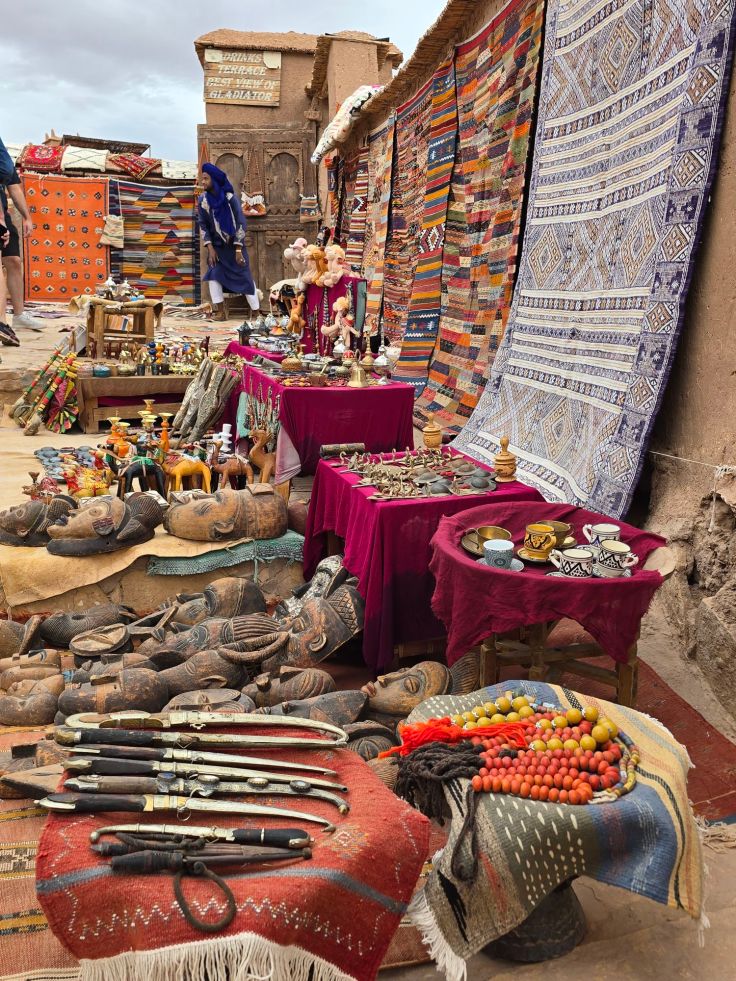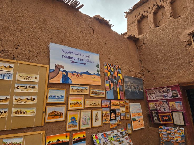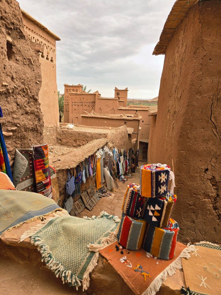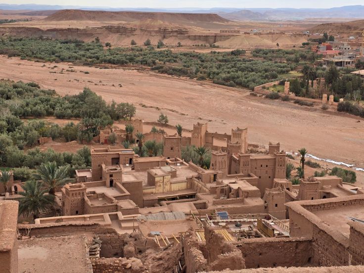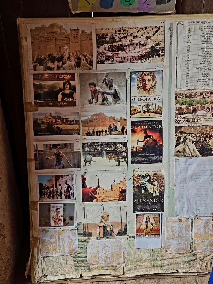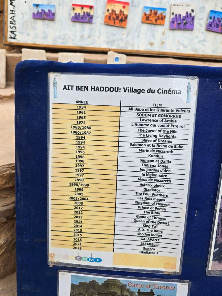 Das ist weder den Touristengruppen noch der Filmindustrie verborgen geblieben. Kein Ort in Marokko wurde öfter als Filmkulisse genutzt als Aït-Ben-Haddou. Schon auf dem Weg dorthin aus dem 30 Kilometer entfernten Ouarzazate, das auch als Hollywood Marokkos bezeichnet wird, kommen wir an Filmstudios vorbei, die auch besichtigt werden können. In Aït-Ben-Haddou hängen überall Plakate mit den hier entstandenen Filmen: die Wüsten- und Trainingslager-Szenen des Gladiators (Russell Crowe), die Sklavenstadt Yunkai, die Khaleesi/Daenerys (Emilia Clarke) in Staffel 3 von Game of Thrones befreien will, Alexander, Die Mumie, Indiana Jones und noch viele mehr wurden hier gedreht. Für den Film „Jesus von Nazareth“ (1977) wurden die Lehmbauten umfangreich saniert, „Prince of Persia“ (2010) ist das große, historisch nicht korrekte (und nicht passierbare) Eingangstor zu „verdanken“. Cineasten sind hier auf jeden Fall im Glück.