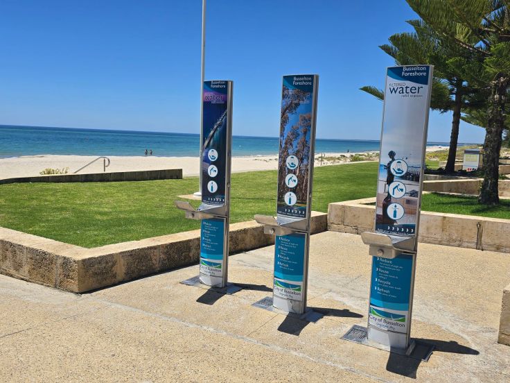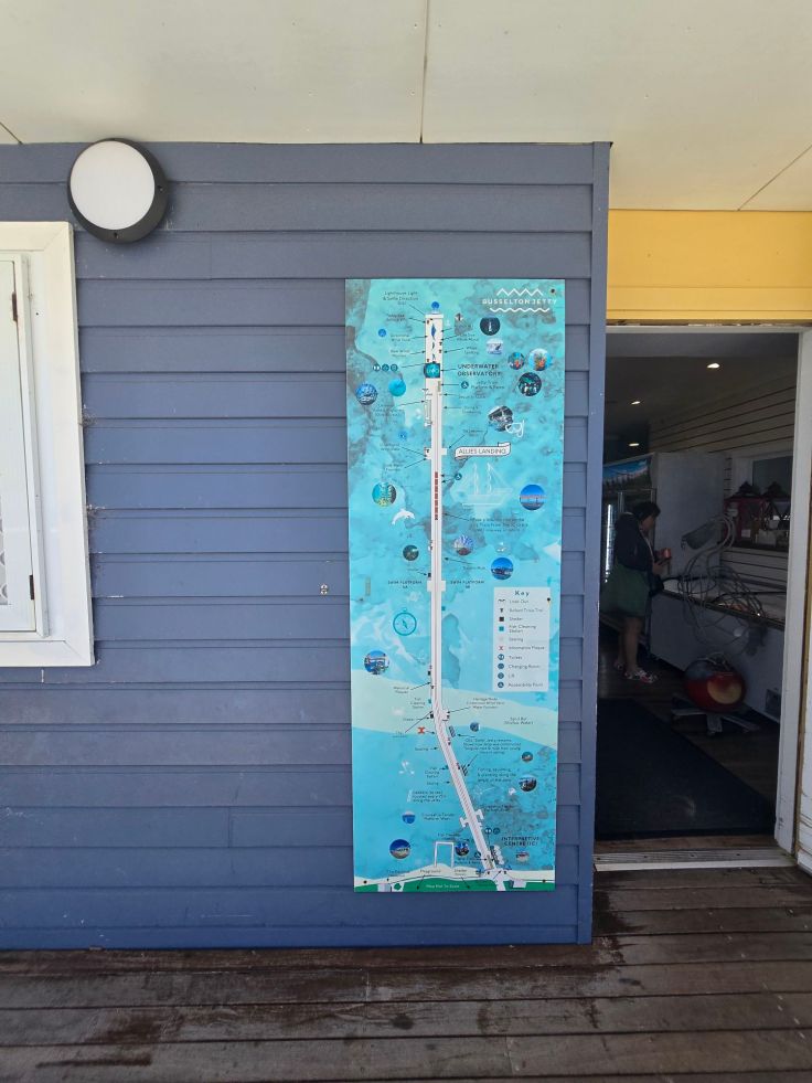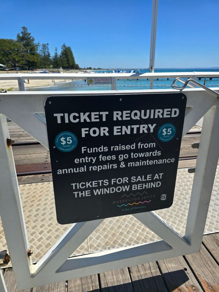 Nach einem sehr empfehlenswerten Mittagessen-Stop im Flow 36 in Bunbury fahren wir weiter nach Busselton, das nächste Küstenstädtchen. Es ist berühmt für seinen Pier. Die „Jetty“ wurde bereits in den 1850er und 60er Jahren erbaut und ist mit knapp zwei Kilometern Länge eine der längsten hölzernen Piere der Welt. Die Jetty ersetzte quasi den Hafen, da die seichten Gewässer vor der Küste keine Be- und Entladung großer Schiffe ermöglichte. Heute ist sie eine Touristenattraktion, deren Begehung 5 Dollar kostet. Alternativ kann gegen zusätzliches Entgelt ein Zug genommen werden, um bis an die Spitze zu gelangen, wo sich ein Meeresaquarium befindet. Und weil es sich hier mustergültig zeigt noch ein weitere Hinweis zu Westaustralien: Nahezu überall gibt es kostenlose öffentliche Toiletten und vielerorts auch kostenlose öffentliche Wasserspender. Ein Segen.