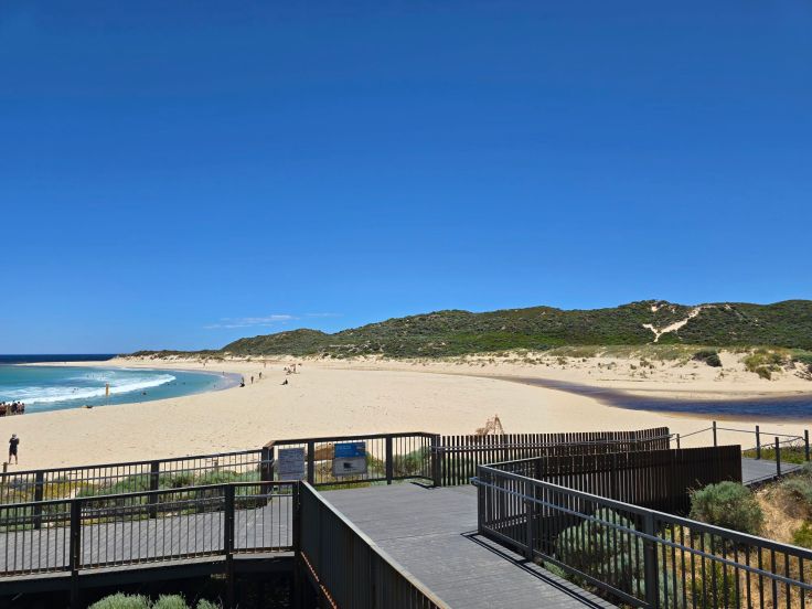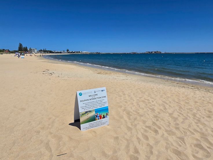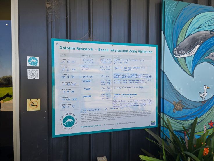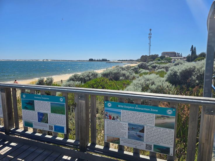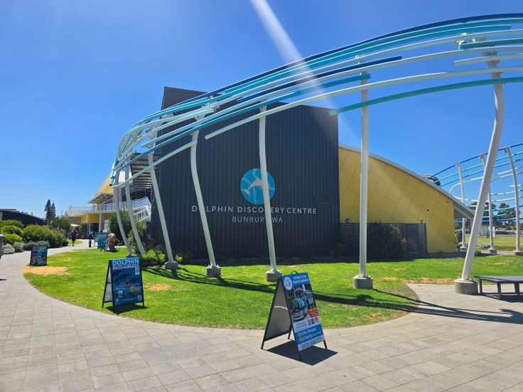 In Bunbury liegt das Dolphin Discovery Centre, eine gemeinnützige Institution zum Schutz der lokalen Delfinpopulation mit Bildungs- und Forschungsauftrag. Das Zentrum umfasst neben einem Café/Restaurant und Souvenirshop ein kleines Aquarium und „Meeresentdeckungsbereich“ (kostenpflichtig; natürlich ohne Delfine), es bietet verschiedene Delfin-Touren an und – deshalb sind wir hier – eine „Delfin-Interaktionszone“ (kostenlos). Fast jeden Morgen (beste Chancen bestehen zwischen 8 und 12 Uhr) kommen die wilden Delfine direkt an den Strand vor dem Zentrum und freundliche Ehrenamtliche in roten Shirts beantworten alle Fragen rund um die Tiere. Eine Tafel am Eingang zeigt auf, welche Delfine in den letzten Tagen da waren – an unserem Tag leider keine. Da wir wissen, dass wir im Verlauf des weiteren Urlaubs noch wilde Delfine sehen werden, sind wir nicht allzu enttäuscht.