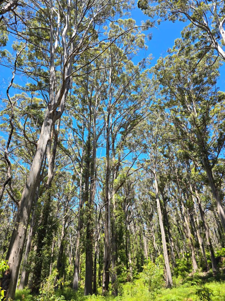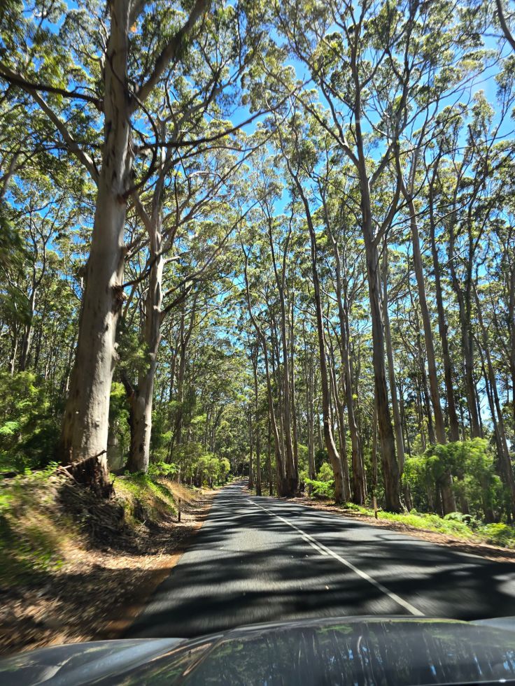 Wer sich an den ganzen Stränden sattgesehen hat und schattige Abkühlung sucht, der sollte einen Abstecher in den Karri-Forest von Boranup machen. Karris (Eukalyptus diversicolor) sind bis zu über 80 Meter hohe schlanke Bäume, die ausschließlich im Südwesten Australiens beheimatet sind. Die Cave Road führt direkt durch den Karri-Wald mit einem Stop am Boranup Forest Viewpoint. Wir sind auch auf einer unbefestigten Straße zum Boranup Lookout gefahren, eine schöne Fahrt durch den Wald mit Sichtung einer (leider überfahrenen) Tannenzapfenechse. Der Lookout selbst ist hingegen wenig spektakulär. Der Vollständigkeit halber sei noch erwähnt, dass es entlang der Cave Road, wie der Name vermuten lässt, zahlreiche Höhlen zu besichtigen gibt. Wir fanden die Küstenlinie und die Wanderwege spannender.