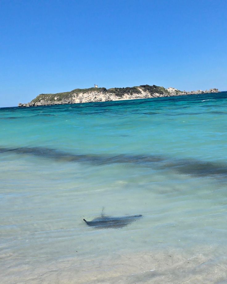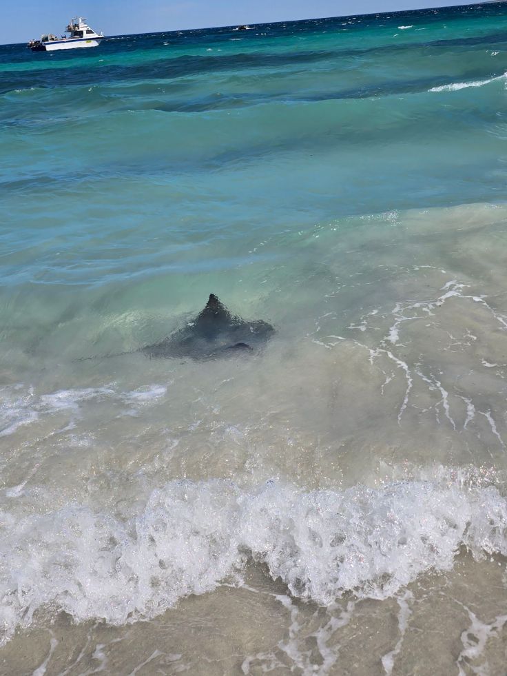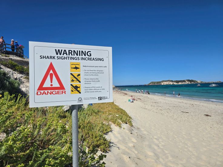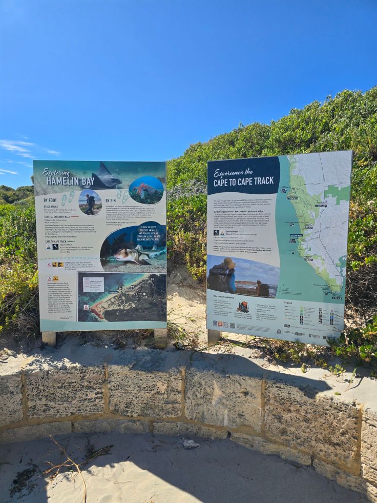 Wir beginnen unsere Strandtour am südlichen Ende des Nationalparks, in der Hamelin Bay. Endloser Sandstrand Nummer eins. Und getoppt wird das Ganze durch die nahezu garantierte Anwesenheit von Rochen (am besten zu sehen in den Morgenstunden), die sich immer schön entlang der Brandungszone bewegen. Ob welche da sind, seht ihr sofort: Die Menschengruppen folgen ihnen, strandabwärts – kehrt marsch marsch – strandaufwärts. Das machen nämlich auch die Rochen, sie patroullieren quasi die südliche Strandhälfte auf und ab. Ein Warnschild macht uns aufmerksam darauf, dass es nicht nur die „platte Hai-Version“ (Rochen sind platte Hai-Verwandte) gibt, sondern auch die für Menschen deutlich gefährliche Hai-Variante. Das gilt – leider – für West- wie für die Ostküste Australiens.