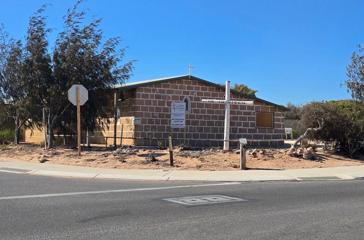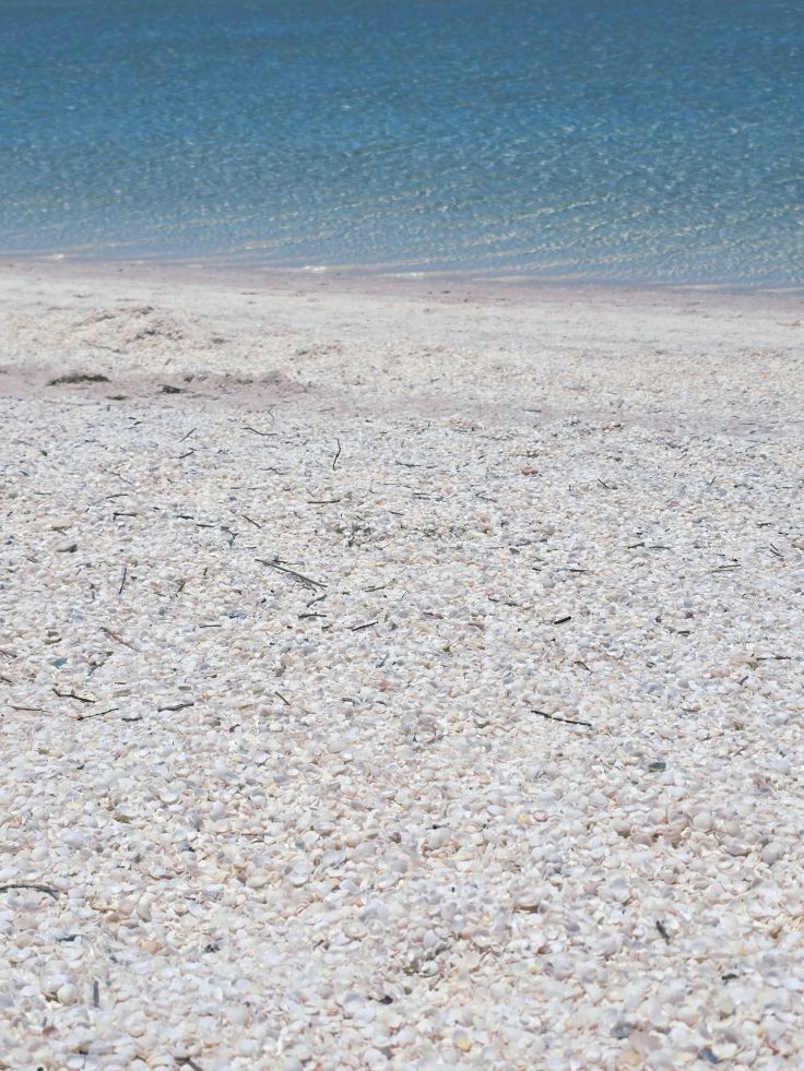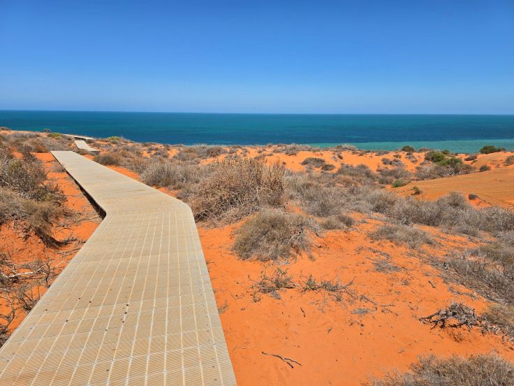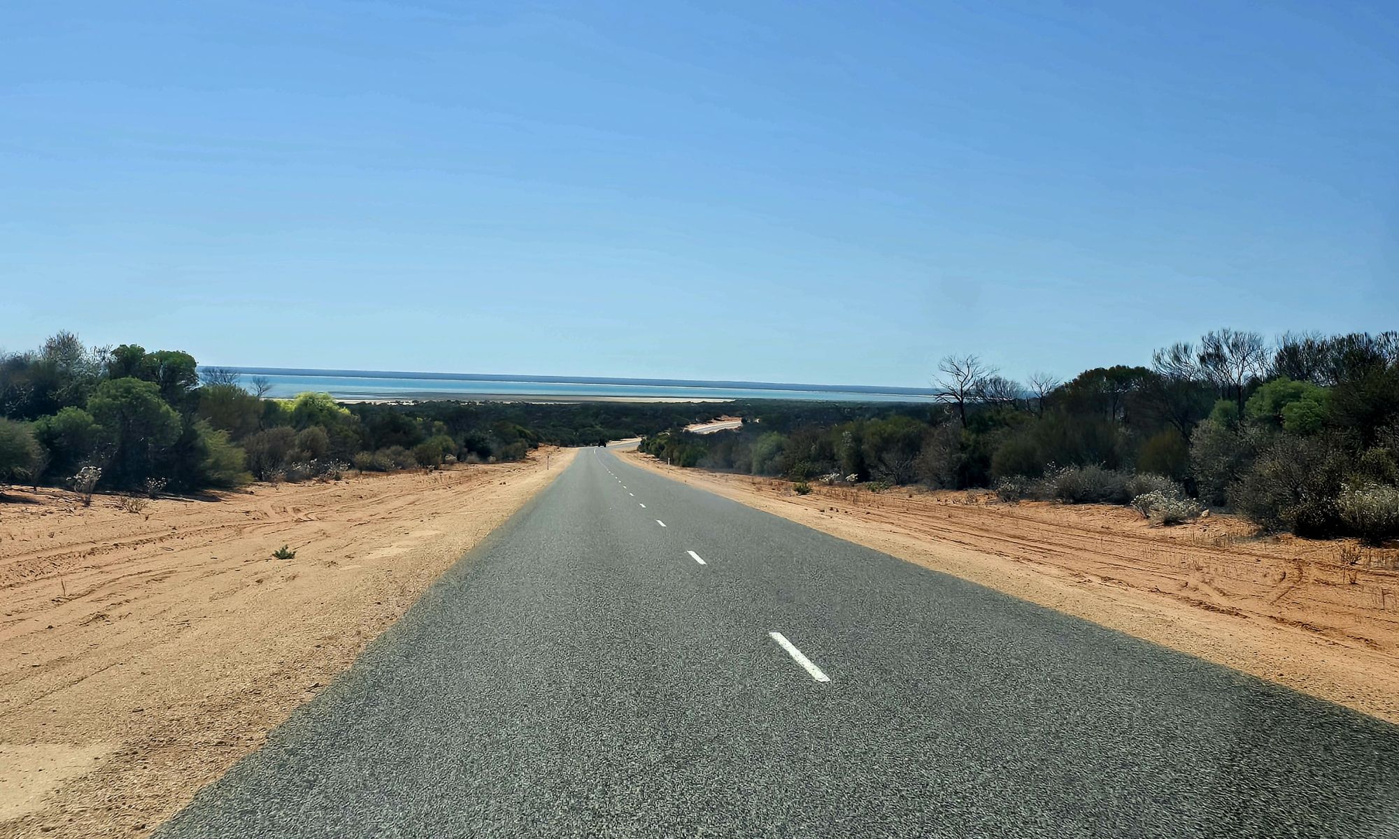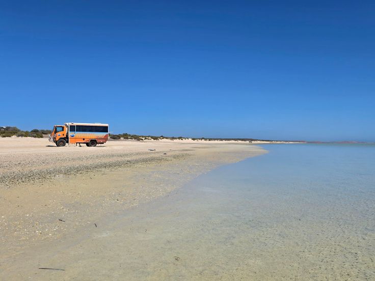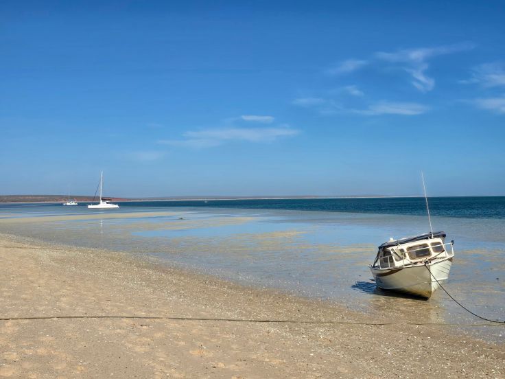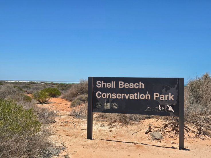Trotz Einsamkeit sind die Straßen auch hier super ausgebaut und wir biegen an der Kreuzung Overlander auf die Halbinsel Shark Bay ab. Ein erster Welterbe-Status-Stopp wäre Hamelin Pool mit seinen Stromatolithen gewesen. Leider wurde der bei einem Sturm 2021 zerstörte Boardwalk noch nicht wieder aufgebaut (Stand Januar 2026), weshalb wir uns diese interessanten Lebewesen später weiter südlich (Lake Thetis bei Cervantes) näher anschauen werden. So findet unser erster Halt in der World Heritage Area an der Shell Beach statt. Diese weitläufige Bucht besteht auf etwa 40 Kilometern Länge und mehreren Metern Tiefe aus Millionen kleiner Herzmuscheln (Fragum erugatum) – ich fühle mich geblendet durch die schneeweißen Muscheln und meine Kamera ist ziemlich gefordert, die Muscheln und das türkisblaue Wasser gleichermaßen einzufangen. In der Tiefe wurden die Muscheln zu einem Muschelkalkstein zusammengepresst, der früher hier abgebaut und im Hausbau verwendet wurde. Davon zeugen zwei Gebäude in Denham: die St. Andrews Church und das Restaurant Old Pearler (auch das Essen ist hier absolut empfehlenswert).