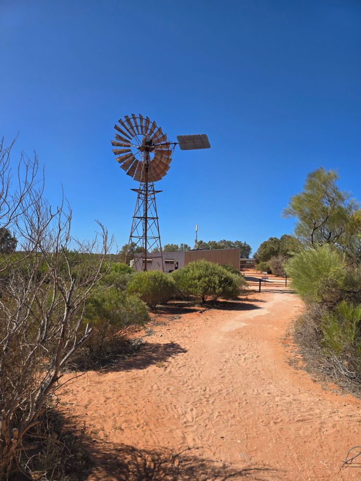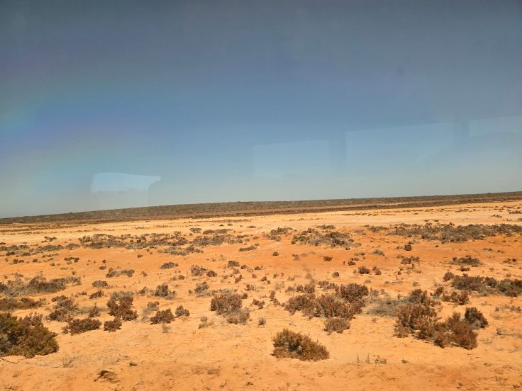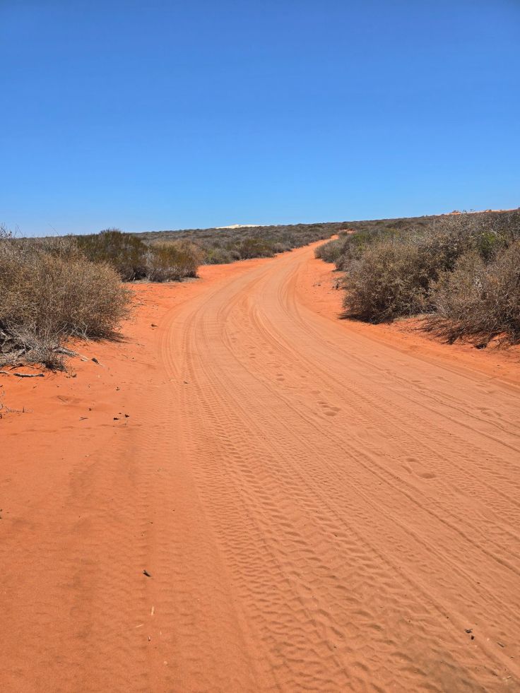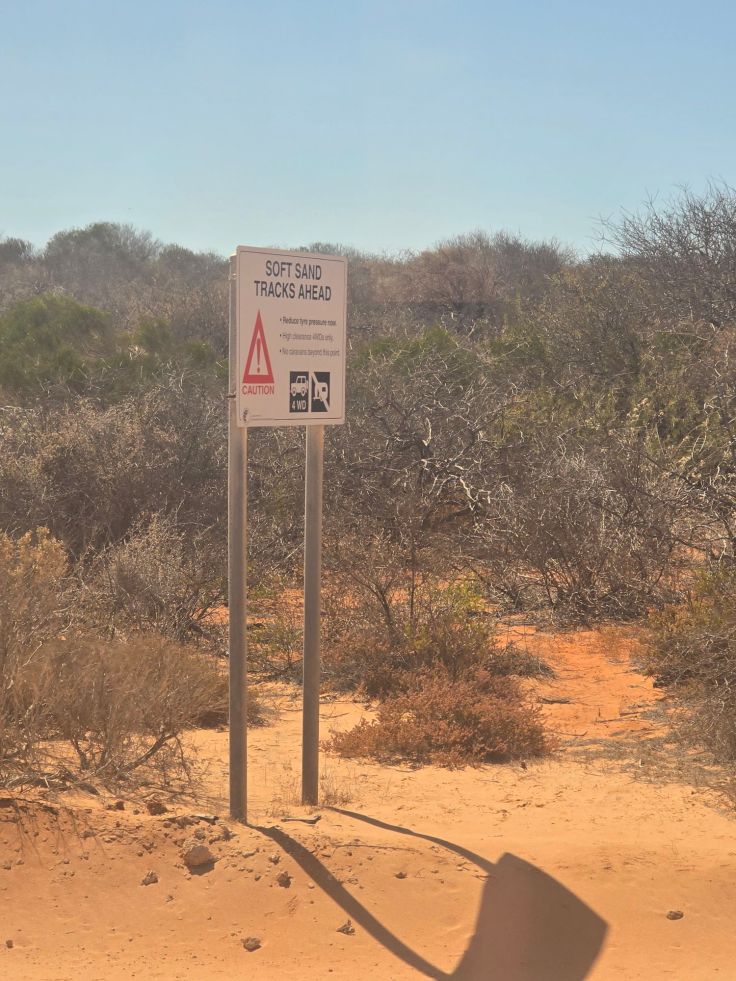 Nachdem auch wir Luft abgelassen haben, geht es los auf die Holper-Pisten-Tour durch den Park (wer schon einmal auf Fraser Island / K’gari war: Das ist schüttelmäßig so ähnlich hier, nur sind die Straßen viel einsamer). Erschwerend kommt hinzu, dass es überall im Park rechts und links der Piste so genannte Birridas gibt, ausgetrocknete Salzpfannen, sofort erkennbar an einer völlig anderen Vegetation. Sie haben oberflächig eine harte Salzkruste, wer hier aber mit einem schweren Fahrzeug einbricht, bleibt im darunterliegenden weichen Untergrund ganz sicher stecken – wir sehen einige entsprechende Spuren, wo wohl meist männliche Abenteuerlust sehr schnell sehr teuer wurde.
