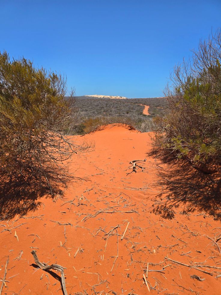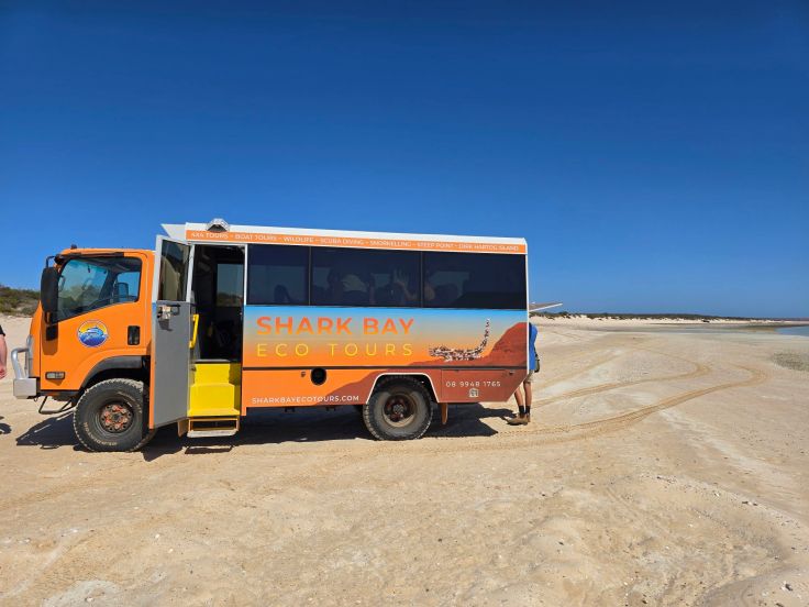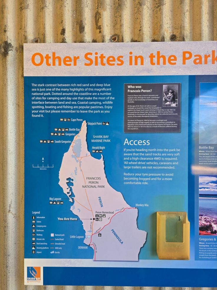 Der nach einem französischen Zoologen benannte Francois-Péron-Nationalpark nimmt die gesamte Spitze der Halbinsel ein (Eintritt wird erhoben, im Nationalparkpass enthalten). Vom Ende des 19. bis 20. Jahrhunderts wurde das Gebiet fast 100 Jahre lang als Schaffarm benutzt, mit mäßigem Erfolg, dann hat die Regierung das Land aufgekauft. Die ehemaligen Wirtschaftsgebäude stehen noch, Tafeln und eine Ausstellung informieren über die Geschichte und Natur. Bis hierher, zum Peron Heritage Precinct, können auch normale Fahrzeuge fahren, danach auf den Sandpisten nur noch 4×4 mit hohem Radstand und weniger Luft in den Reifen. Da wir kein solches Fahrzeug gemietet haben, nehmen wir an einer Tour von Shark Bay Eco Tours teil. Tatsächlich sind wir froh, nicht selbst gefahren zu sein, ob mit oder ohne geeignetem Fahrzeug. Über den Tag hinweg sehen wir insgesamt 10 bis 15 andere Autos, drei davon stecken im Sand fest – ich würde mal sagen, die Chancen darauf sind ziemlich gut. Unser Guide informiert uns, dass „Jimmy“ aus Denham für die Befreiung mittlerweile mehr als 1.000 Dollar verlangt, ich schätze mal, Jimmy hat ein gutes Leben.