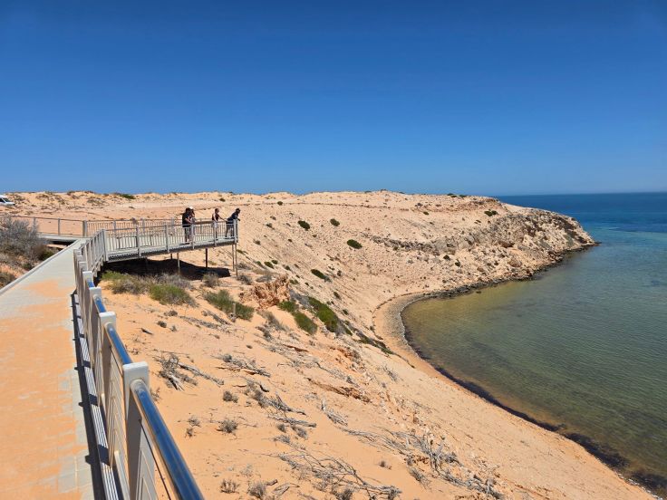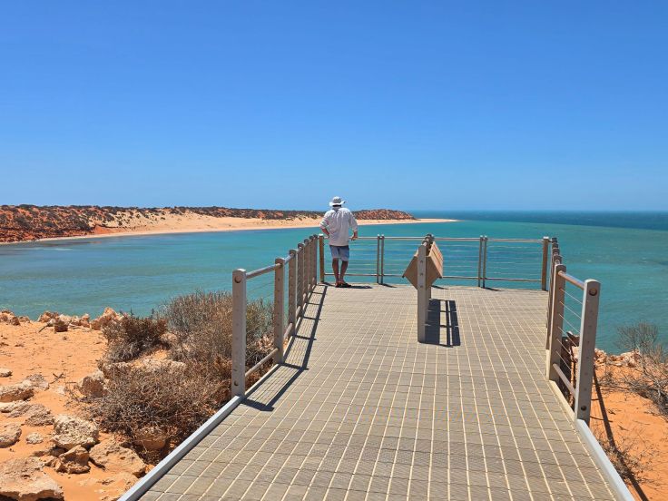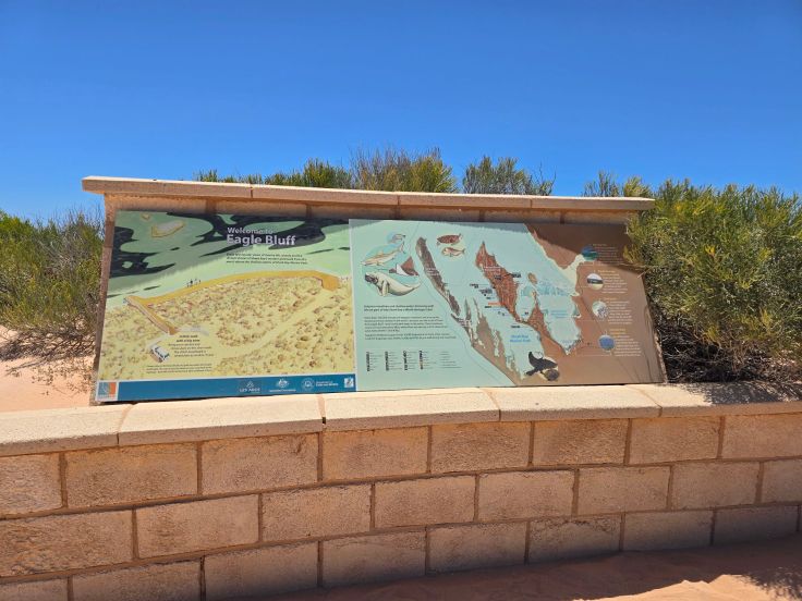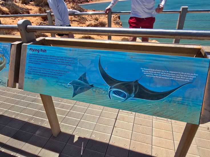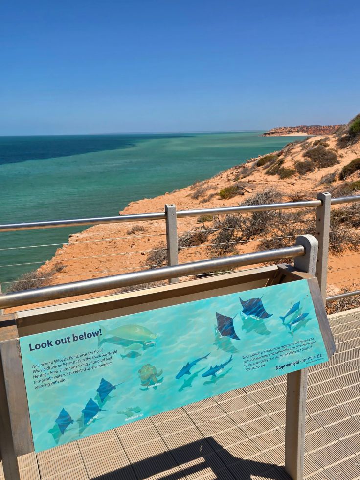 Wir passieren mit einem kurzen Stopp am Whale Point Lookout und halten länger am Eagle Bluff Lookout. Auch hier finden wir einen Parkplatz sowie einen hübschen Boadwalk mit Aussichtspunkten und Infotafeln entlang des Kliffs vor – die Infrastruktur un den westaustralischen Nationalparks ist wirklich vorbildlich. Im türkisblauen Meer sind Haie und Rochen zu erkennen, in der Ferne die benachbarte Halbinsel Edel Land. Ein schöner Spot!