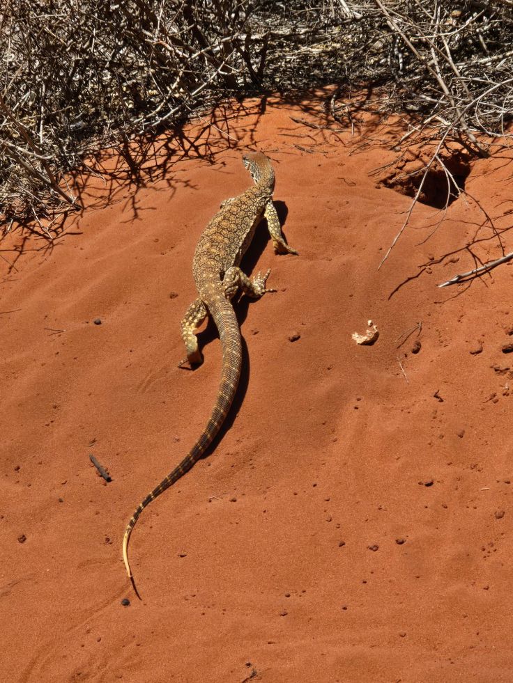 Weiter geht es zur nördlichen Spitze der Halbinsel, dem Cape Peron. Hier bläst der Wind mal wieder was das Zeug hält, aber auch hier ist die Szenerie mit besagter Dreifarbigkeit großartig. Erneut sehen wir mehrere Mantarochen durchs Wasser ziehen und beim Mittagessen besucht uns ein hübscher großer Goulds Waran, auch Sand Goanna genannt.