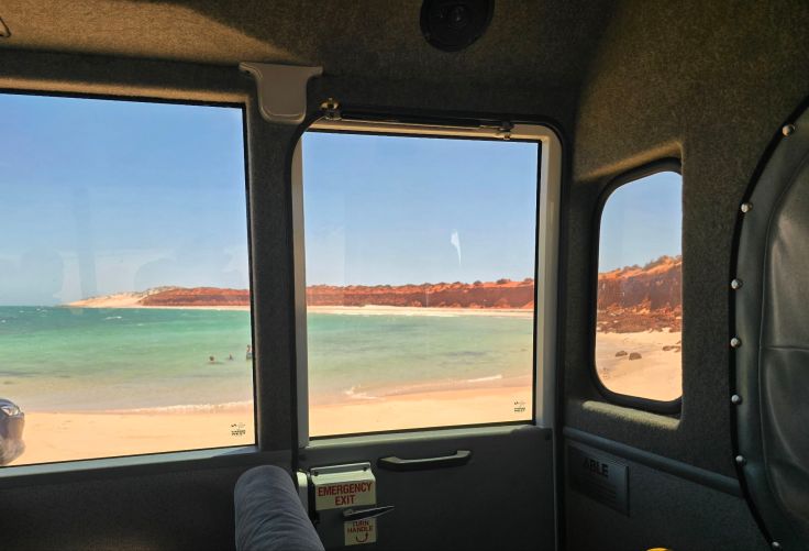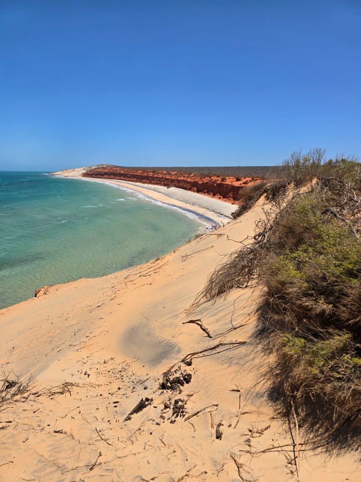 Danach geht es weiter zum nächsten Stop, am Bottle Beach. Was für eine Szenerie: Türkisblaues Wasser trifft auf weißen Sandstrand und rote Klippen. Herrlich! Wir erklimmen erst einmal die Düne und genießen den Anblick von oben, bevor wir uns zum Schnorcheln ins türkisblaue Wasser stürzen (Ausrüstung wird gestellt). Ein Riff schützt die Bucht, dennoch ist das Wasser recht aufgewühlt und die Sicht etwas getrübt. Wir sehen jedoch zahlreiche Fische, Korallen und eine große Schildkröte – leider keinen Riffhai (das meine ich ernst, die sind klein). Tatsächlich wird uns berichtet, dass in der Shark Bay (im Gegensatz zur sonstigen Küste Westaustraliens) noch nie ein Mensch von einem Hai ernsthaft verletzt wurde. Lediglich ein Schaf hätte es mal erwischt, da es keinen Pier in Denham gab und gibt, mussten die Tiere früher für ihren Transport durch das flache Wasser zu den Booten schwimmen.
