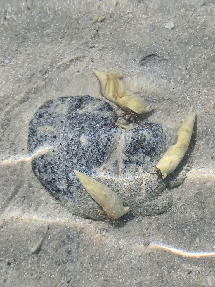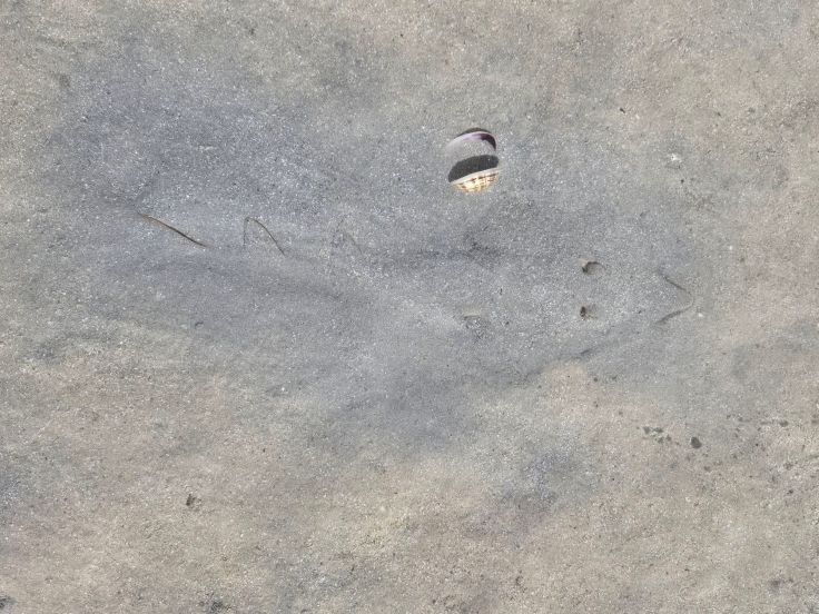 Schließlich kommen wir in der Herald Bight Bucht an. Während unser Guide unser Frühstück im Schatten des Trucks vorbereitet, waten wir durch das flache Wasser und finden kleine Rochen, Flatheats – Plattkopf-Fische -, sowie zahlreiche Schnecken und Muscheln.
