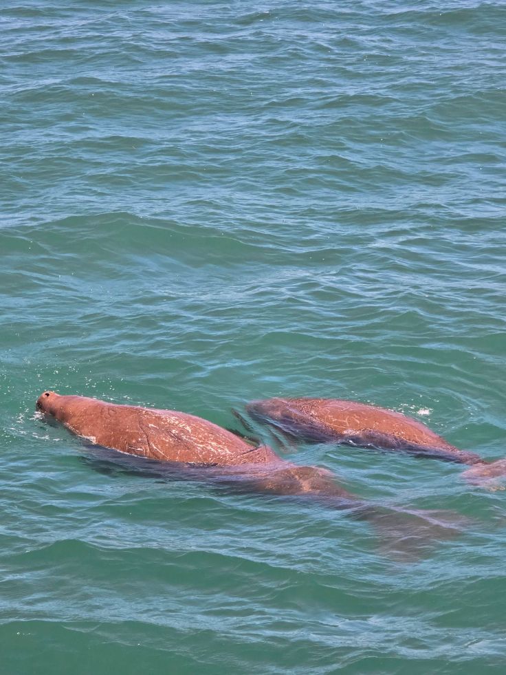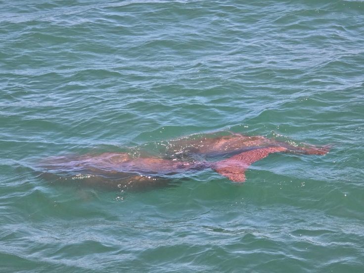 Das zweite Highlight des Tages ist eine Bootstour in der Shark Bay, insbesondere um eine weitere Tierart aus der Nähe zu sehen: die Dugongs (Dugong dugon). Dugongs sind Gabelschwanzseekühe, die im Unterschied zu Manatees (haben wir in Florida gesehen) wal- bzw. meerjungfrau-ähnlich gegabelte Schwanzflossen haben und nur im Salzwasser leben. Etwa zehn Prozent der weltweiten Dugong-Population, rund 10.000 Tiere, lebt in der Shark Bay. Die Pflanzenfresser ernähren sich von Seegras, von dem es in der Shark Bay eine Menge gibt: Nicht nur die weltweit größte Fläche an Seegras, sondern auch die größte bekannte Einzelpflanze der Erde: Das Seegras Posidonia australis erstreckt sich über eine Länge von 180 Kilometern. Also beste Voraussetzungen, die Tiere hier zu sehen. Und auch wir bekommen erfreulicherweise sehr viele teils ganz nah zu Gesicht, meist Mütter mit ihren Kälbern.