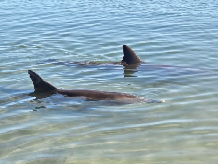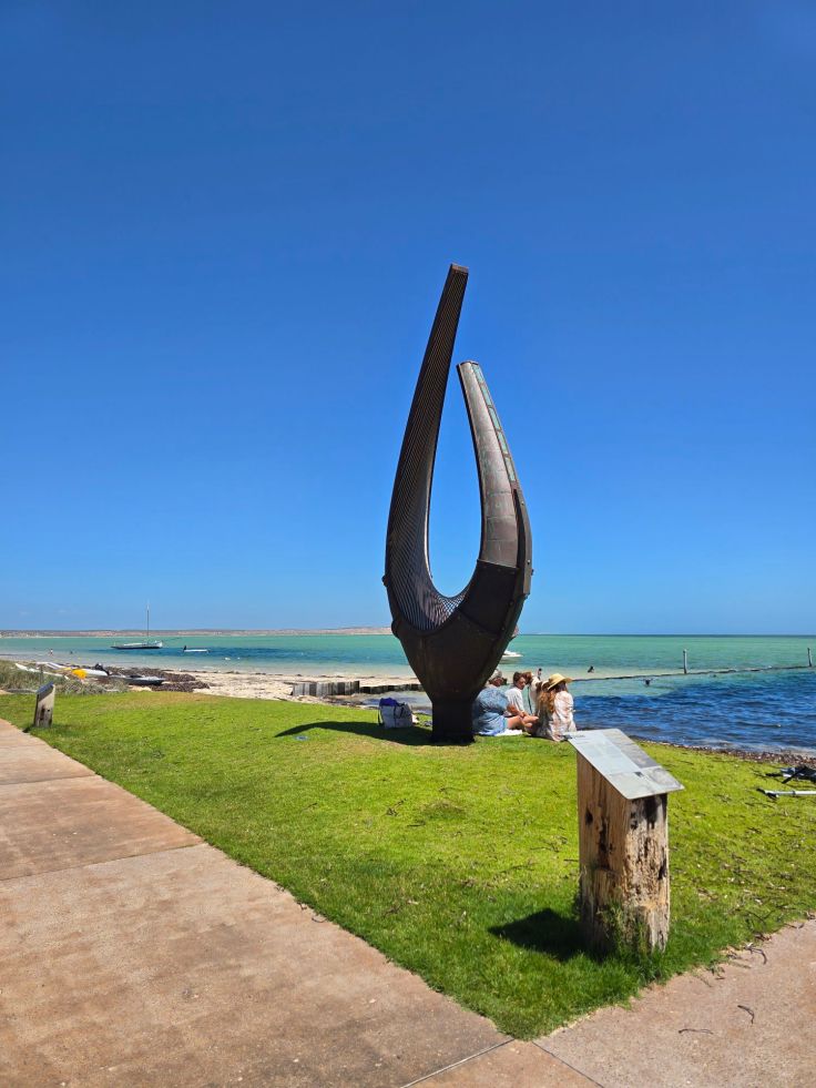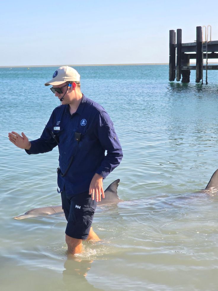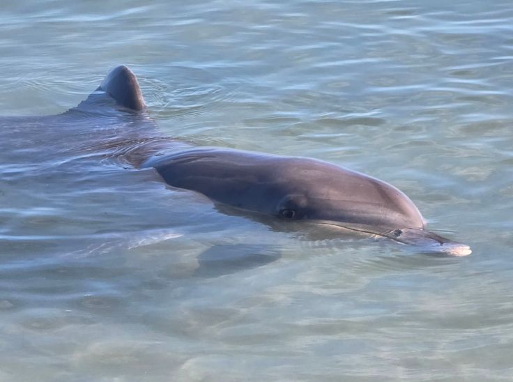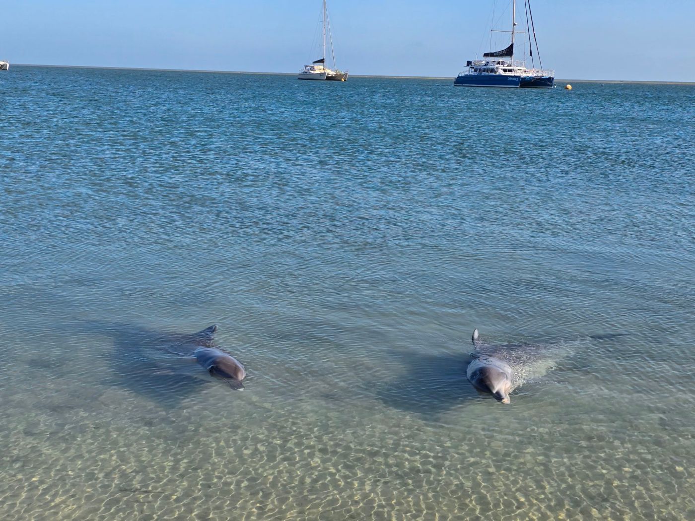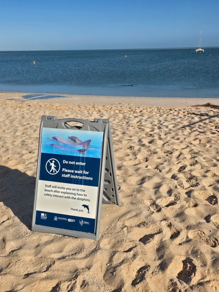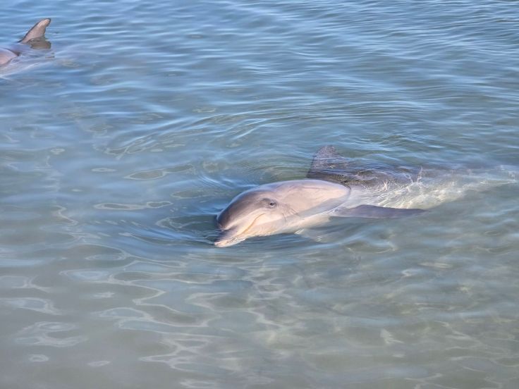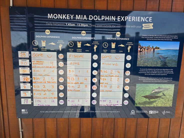 Etwa 25 Kilometer von Denham aus quer über die Halbinsel liegt Monkey Mia. Für den Besuch des dortigen Strands und Conservation Parks wird eine extra Gebühr fällig, die sich aber lohnt, insbesondere wegen der Dolphin Experience. Jeden Morgen kommen wilde Delfine hier an den Strand und holen sich ein kleines Fischfrühstück ab. Es gibt insgesamt drei Fütterungszeiten, die früheste (größte Delfingarantie) um 7:45 Uhr. Freundliche Naturschutz-Ranger informieren uns über die Tiere und das Projekt, bevor die anwesenden erwachsenen Delfine ein paar wenige Fische bekommen. Die staunende und begeisterte Menge steht direkt in der Brandungszone, nur wenige Meter von den Tieren entfernt. Auch wir genießen die Begegnung mit Piccolo und Kiya samt ihren Jungtieren Oboe und Wigi, die sich etwas scheuer im Hintergrund halten, sehr.