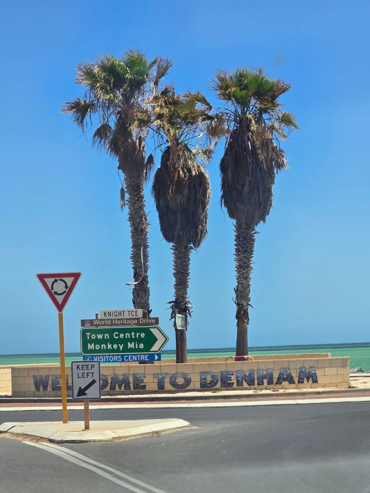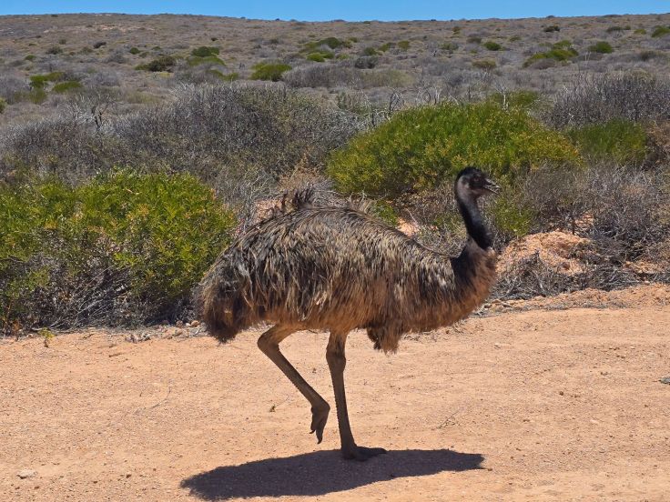 Auf der Weiterfahrt kreuzen zwei Emus unseren Weg (sie treten fast immer paarweise auf), wir werden sie in und um Denham täglich zu Gesicht bekommen. Schließlich erreichen wir Denham, die westlichste Stadt Australiens mit dem westlichsten Hotel des Kontinents. Mitte des 19. Jahrhunderts als Perlenfischerdorf gegründet, deren Bestände jedoch bald erschöpft waren, leben die heute ca. 800 Einwohner vor allem vom Tourismus.